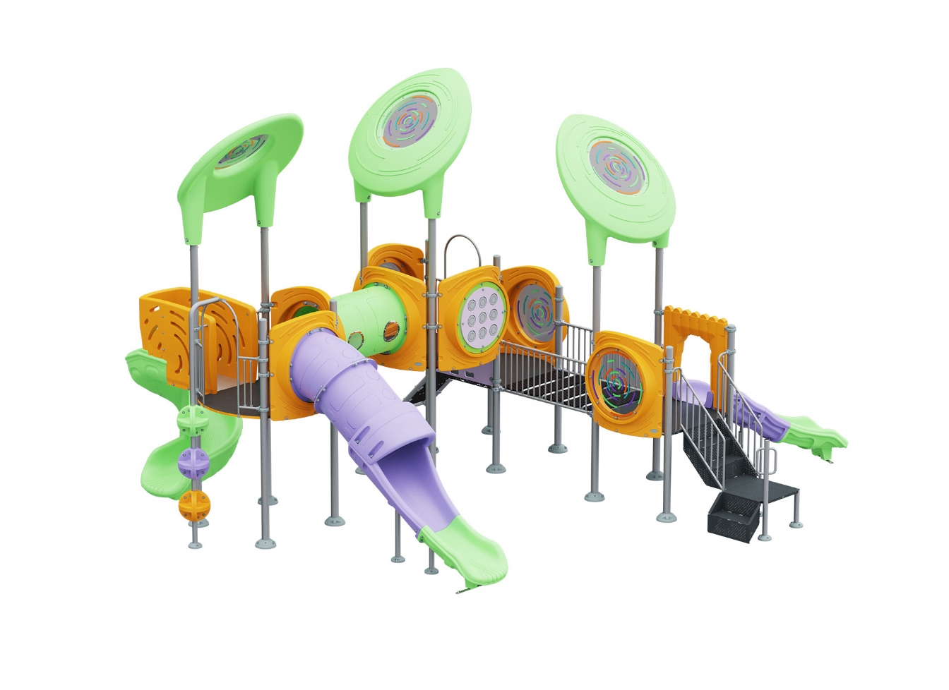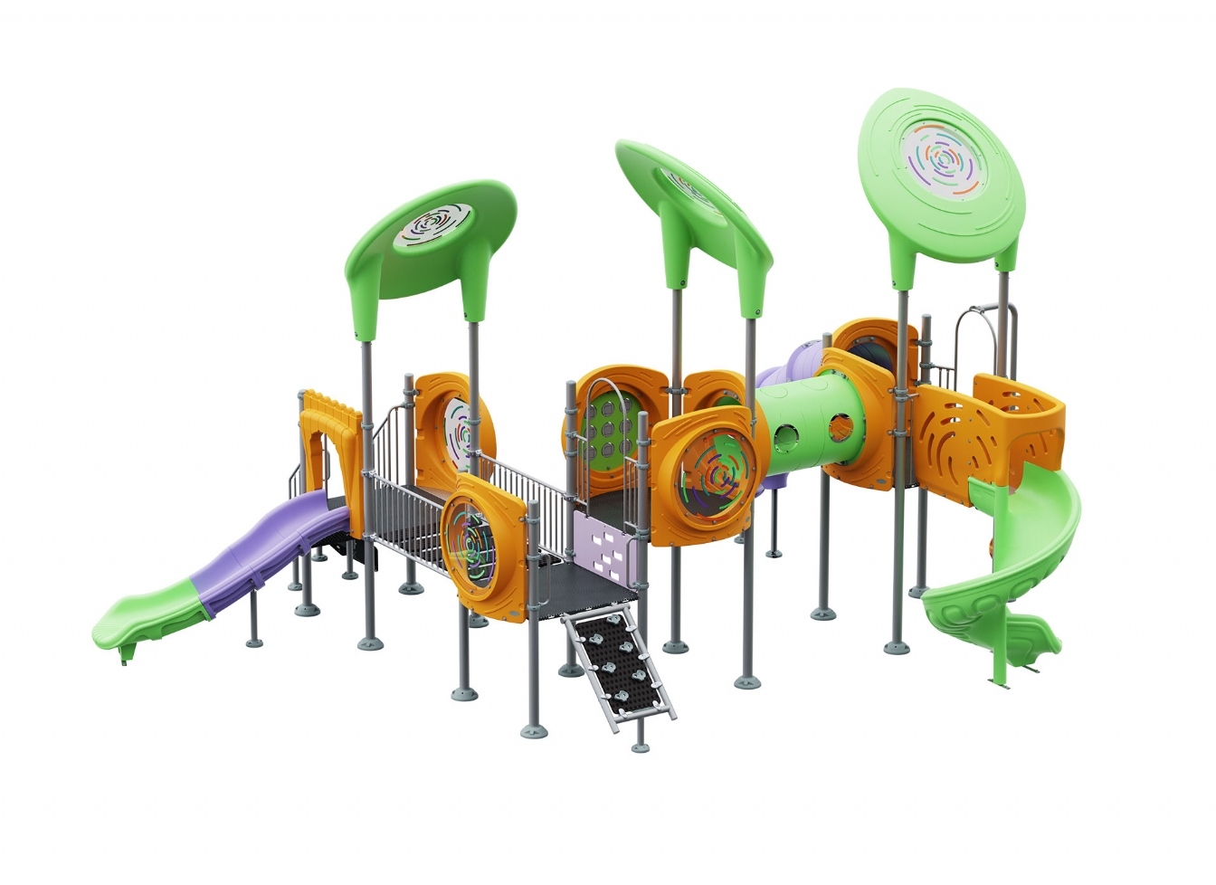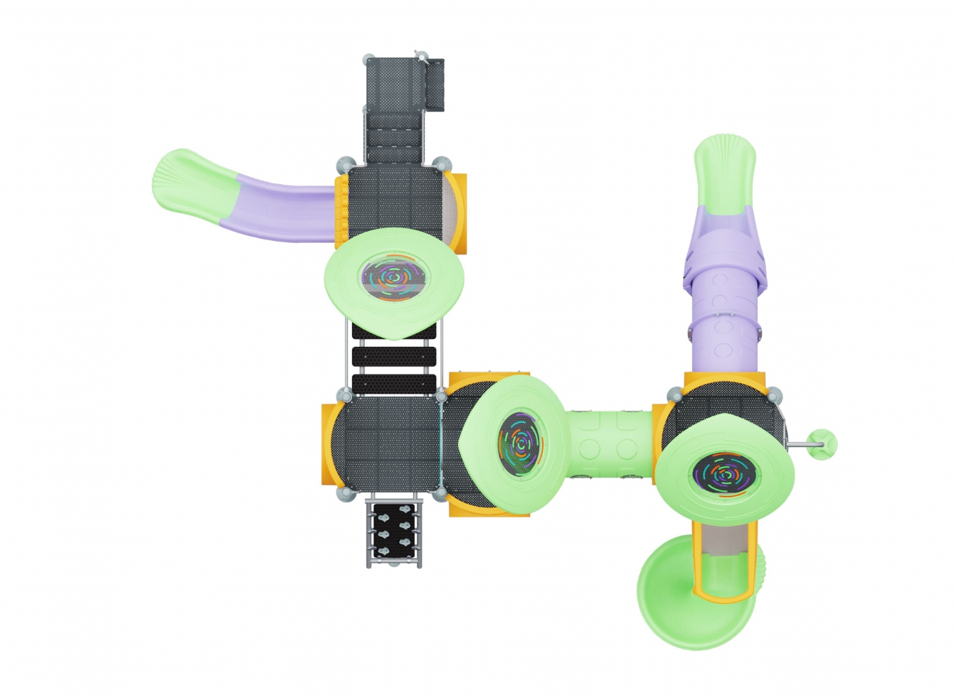 Lekställning Noria i metallprofil, polykarbonat och marinplywood för offentlig miljö.