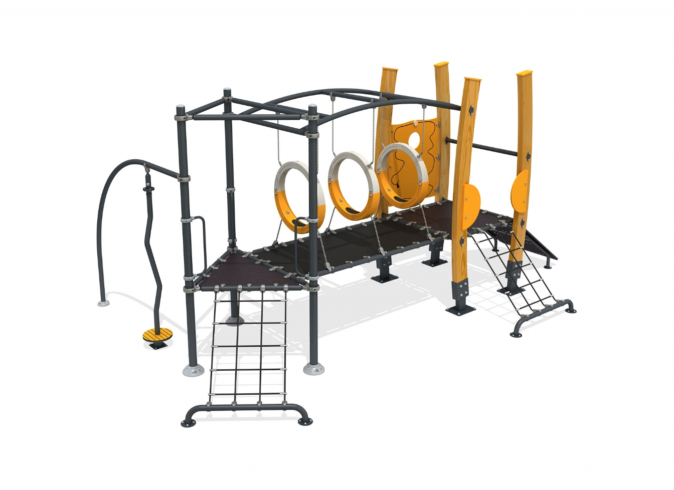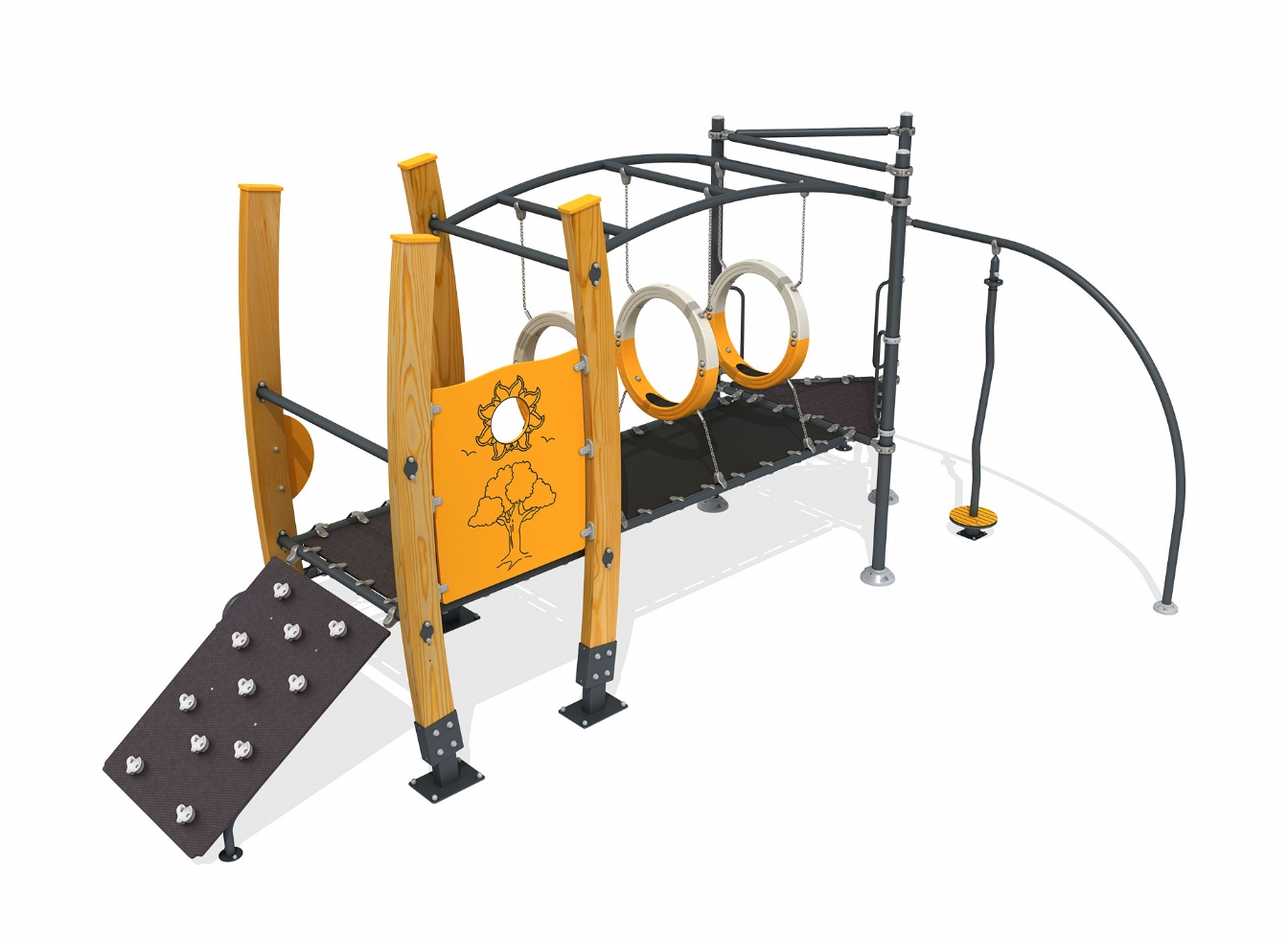 Lekställning Norina i metallprofil, polyeten och trä för offentlig miljö.