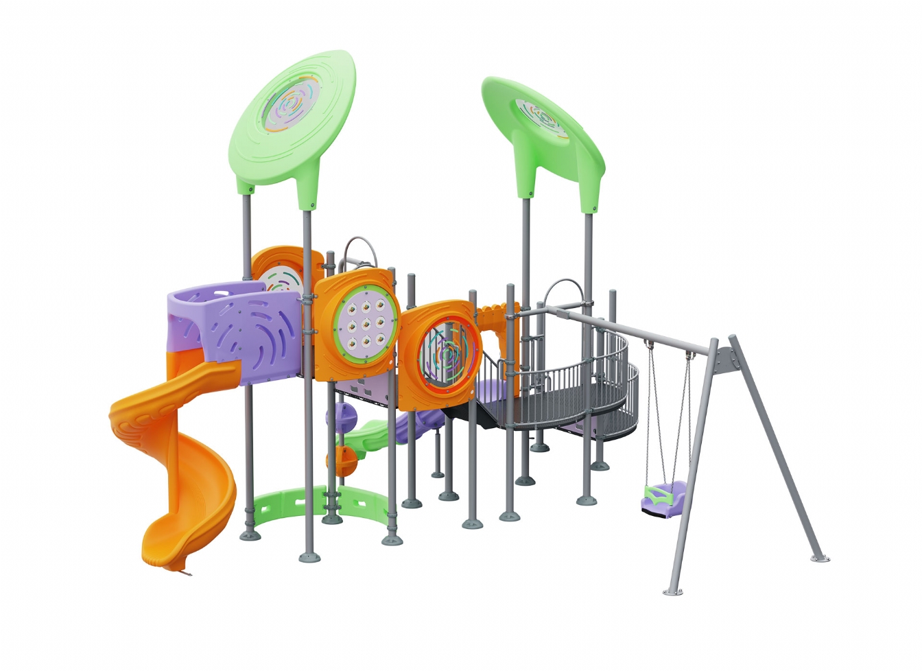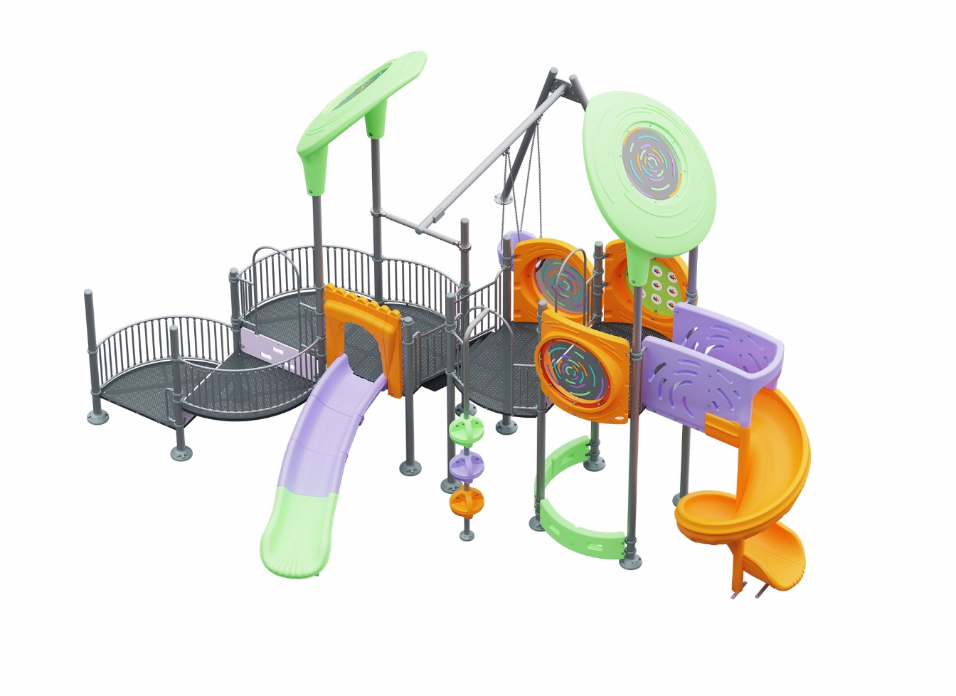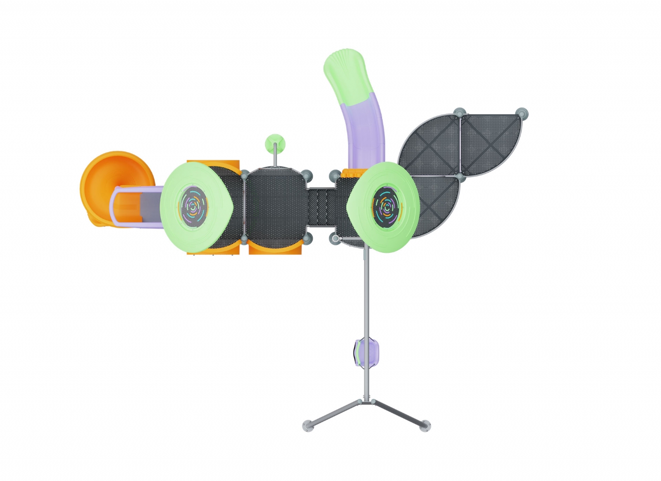Lekställning Noro i metallprofil, polykarbonat och marinplywood för offentlig miljö.