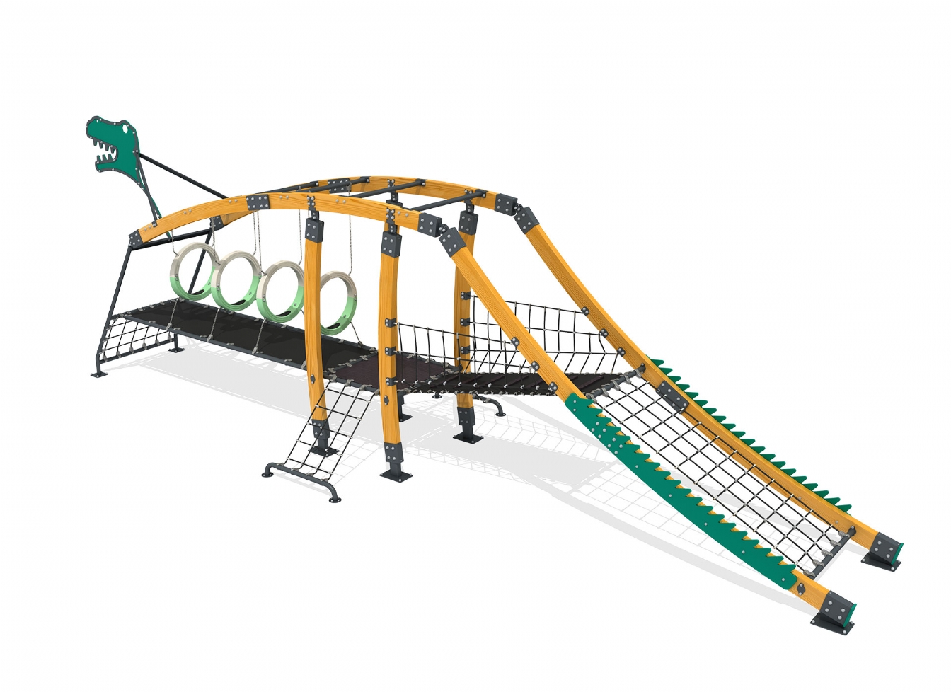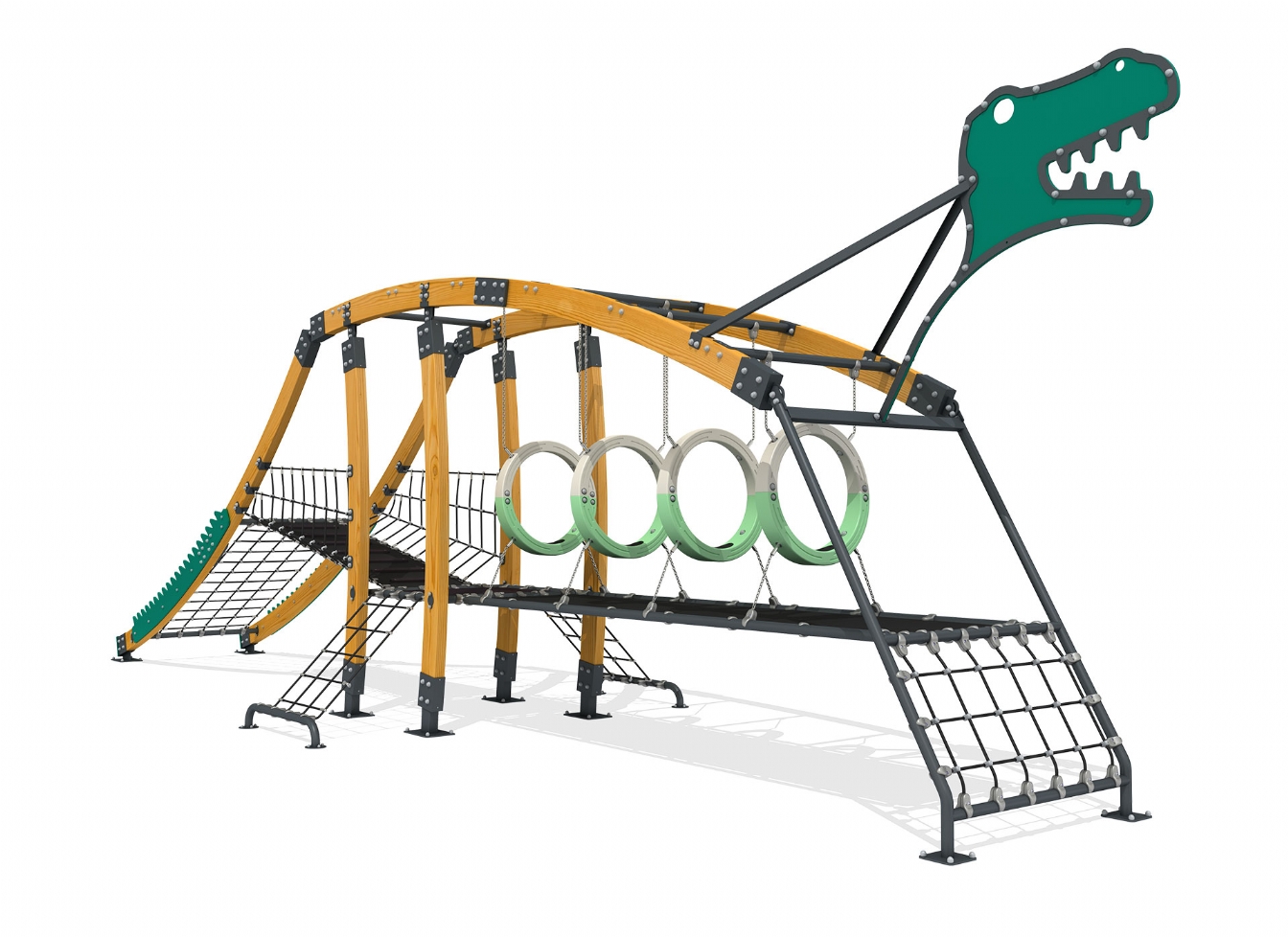 Lekställning Norora i metallprofil, polyeten och trä för offentlig miljö.