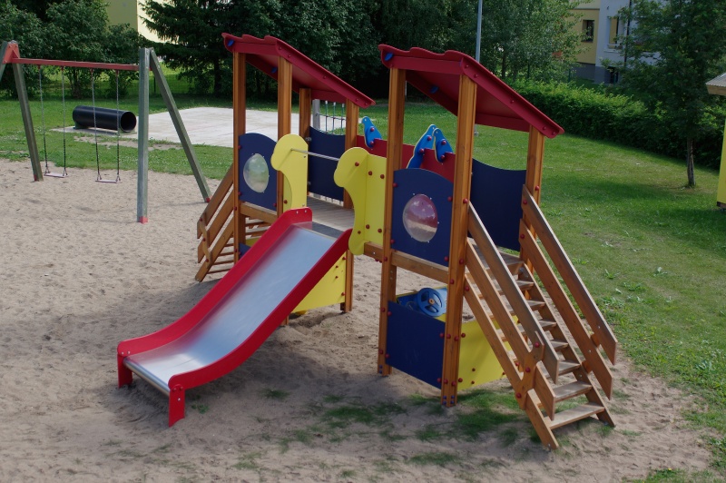 Attraktiv lekställning med två plattformar, rutschkanor och roliga detaljer som skapar variation och stimulerar fantasi och rörelse.