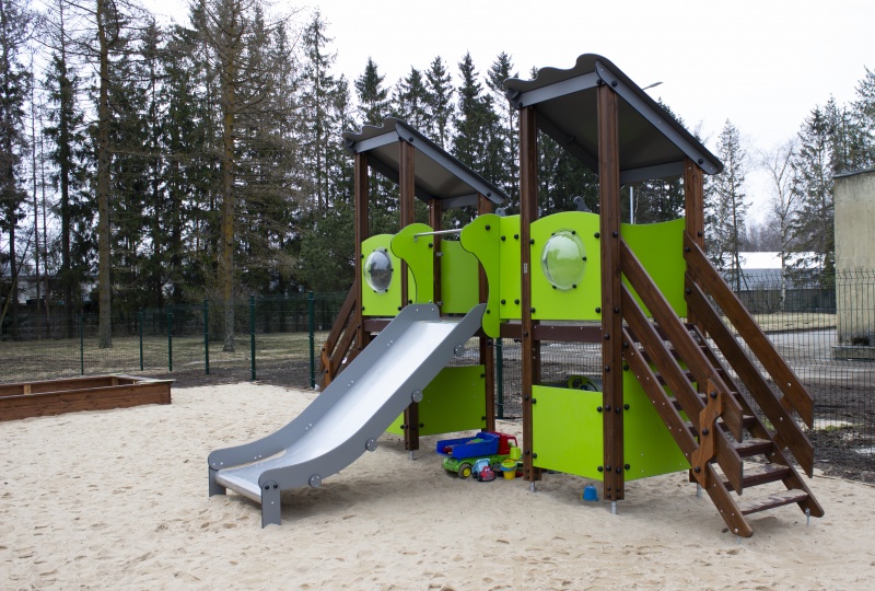 Lekcentret består av två plattformar, två trappor med ledstänger, rutschkanor i rostfritt stål, sluttande tak samt lekhörnor. Barnen kan kika ut genom hyttventiler och upptäcka dekorativa detaljer som väcker nyfikenhet. Sidopanelerna kan ersättas med olika aktivitetsväggar eller tematiska tryckta motiv såsom djur, fåglar, fiskar, träd eller bär. Panelernas slutliga utformning tas fram tillsammans med kunden.