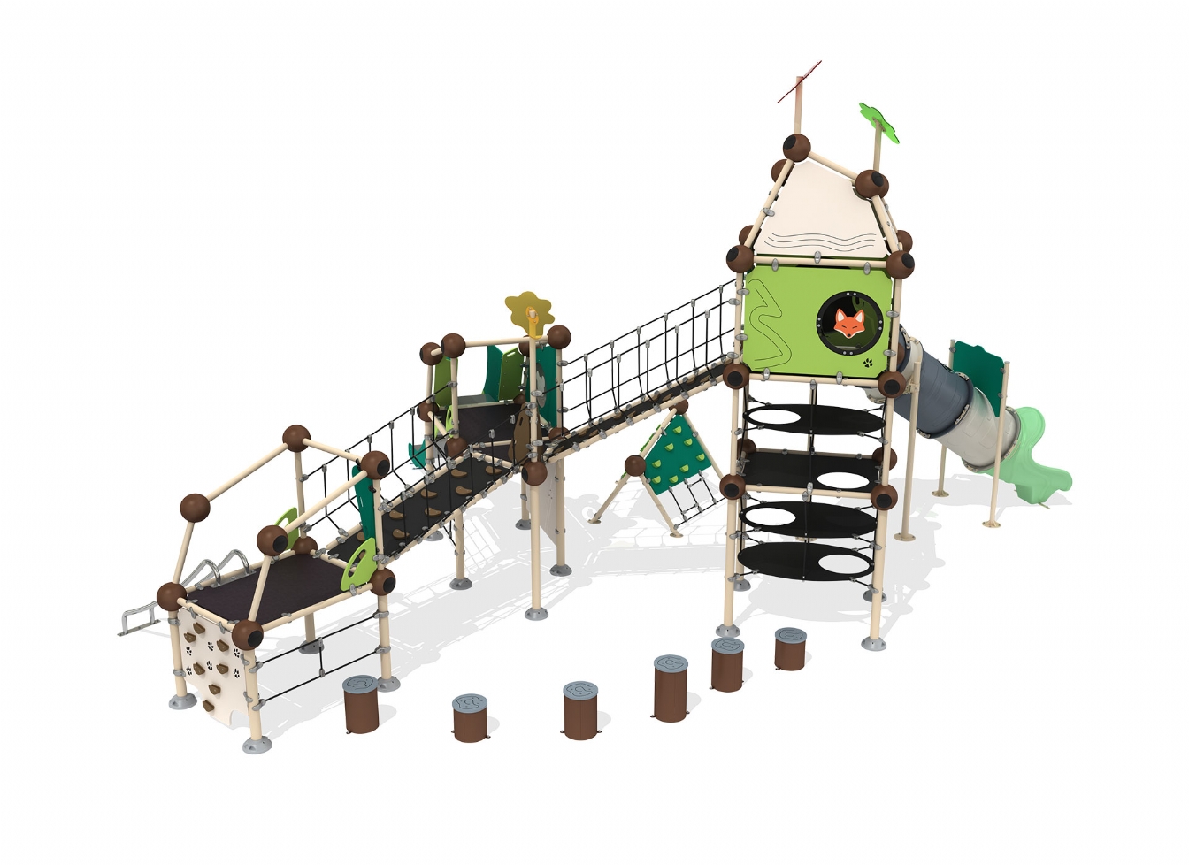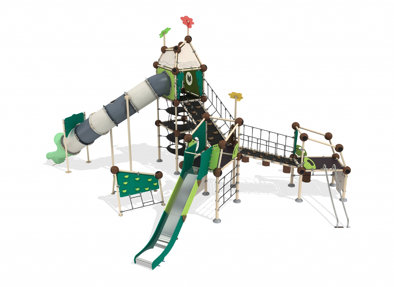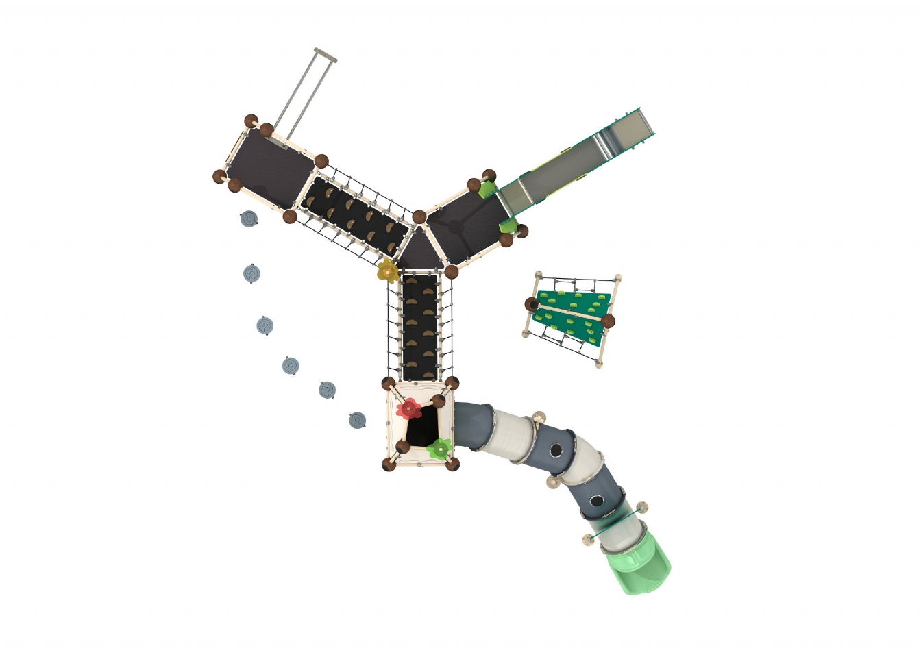 Lekställning Oreno i HDPE, HPL och stålvajer för offentlig miljö.