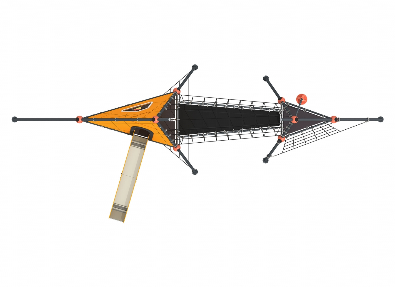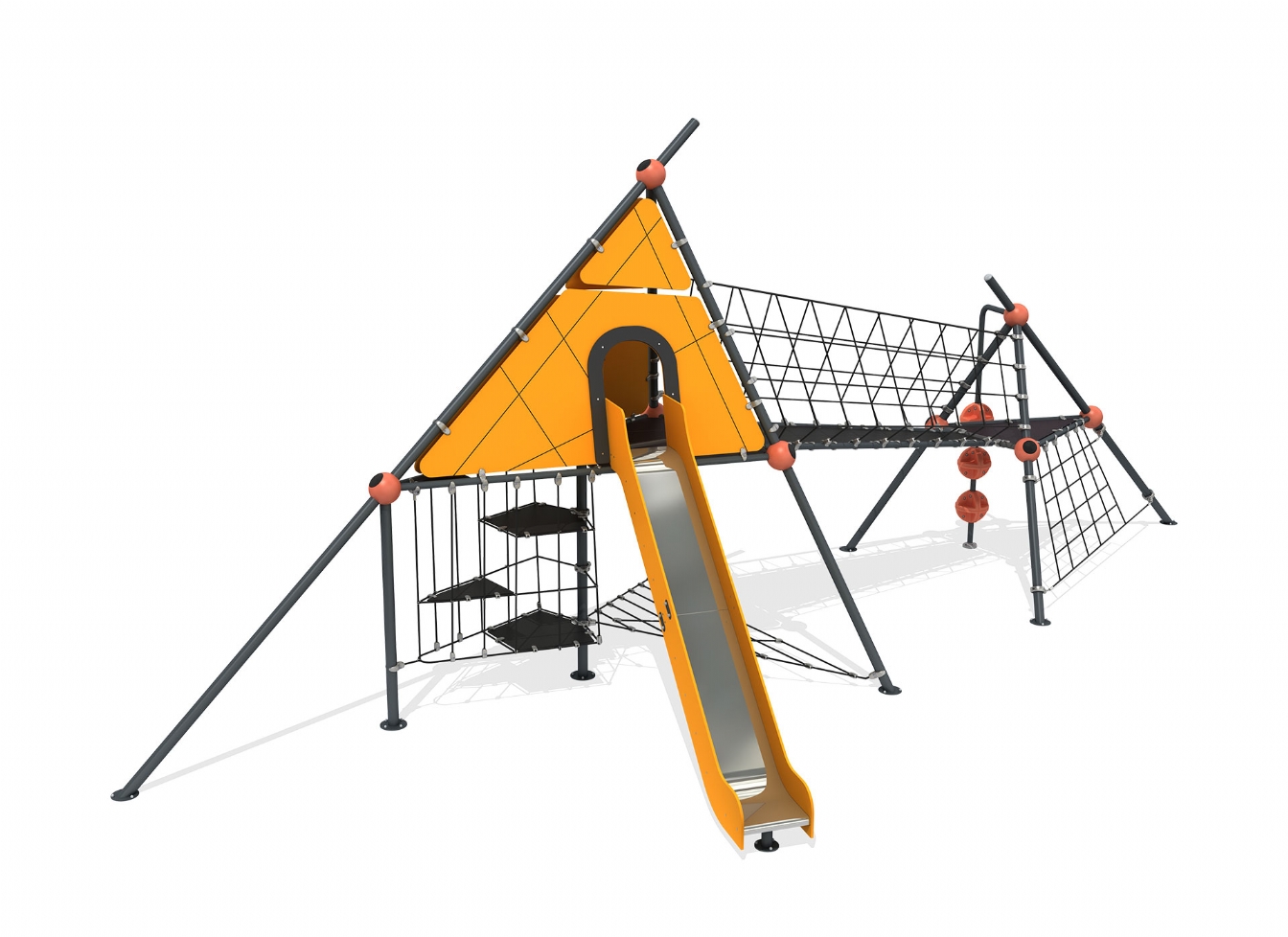 Lekställning Orilo i HDPE, HPL och stålvajer för offentlig miljö.