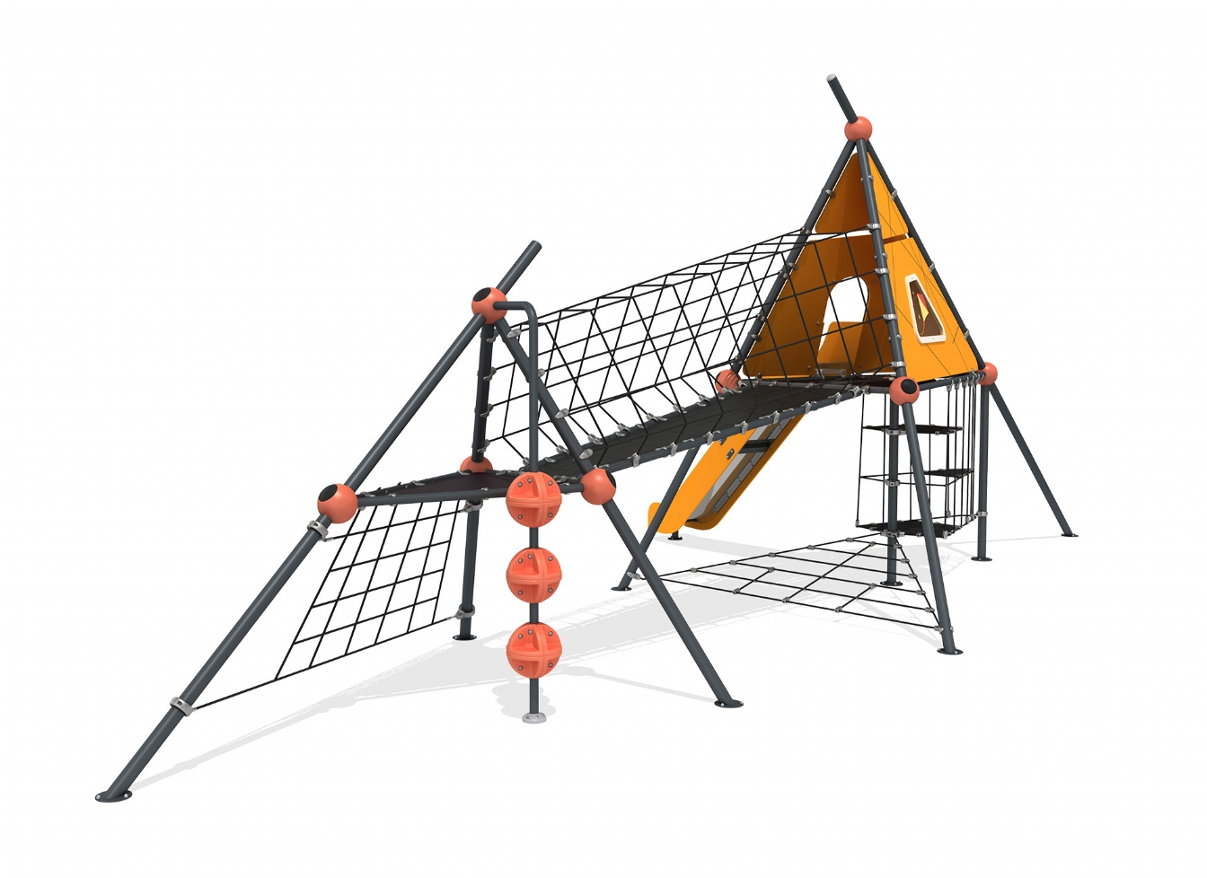 Lekställning Orilo är utvecklad för lekplatser, skolor, förskolor och andra offentliga utemiljöer. Produkten har bredd 1243 cm, djup 531 cm och höjd 482 cm. Specifikationen omfattar säkerhetszon L 1543 x W 875. Utförandet i HDPE, HPL och stålvajer ger en tålig konstruktion som lämpar sig för återkommande användning i krävande miljöer. Den är anpassad för upp till 35 barn och rekommenderad ålder 3-16.