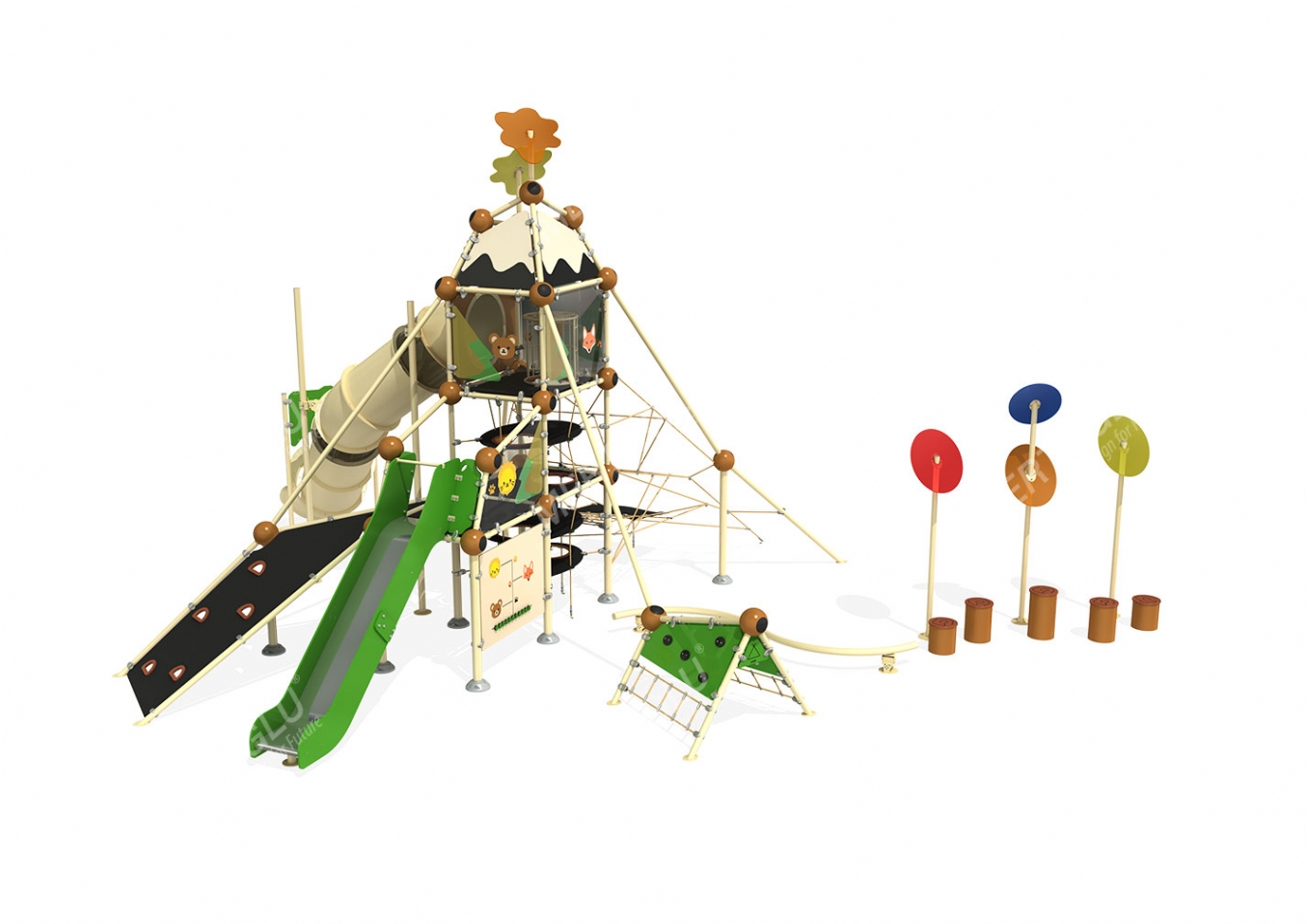 Lekställning Orula i HDPE, HPL och plywood för offentlig miljö.