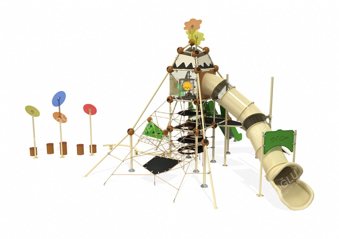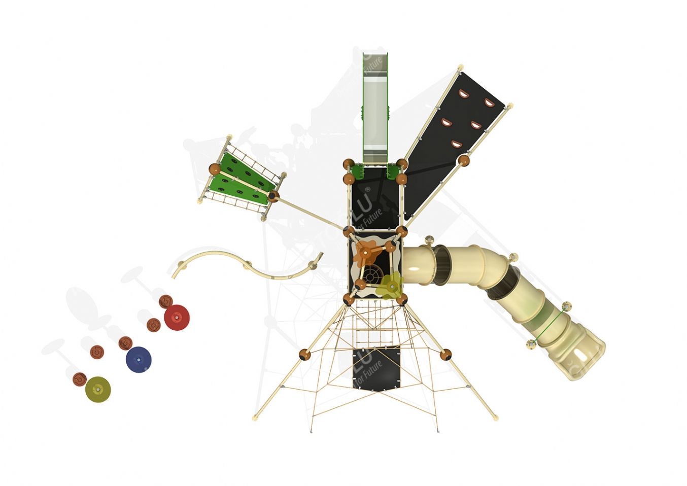 Lekställning Orula är utvecklad för lekplatser, skolor, förskolor och andra offentliga utemiljöer. Produkten har höjd 5,51m. Specifikationen omfattar säkerhetszon 12,94×10,06cm. Utförandet i HDPE, HPL, plywood och stålvajer ger en tålig konstruktion som lämpar sig för återkommande användning i krävande miljöer. Den är anpassad för upp till 10 barn.