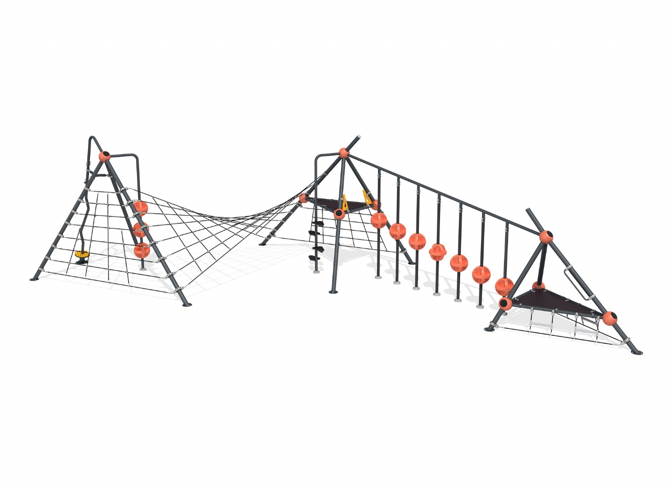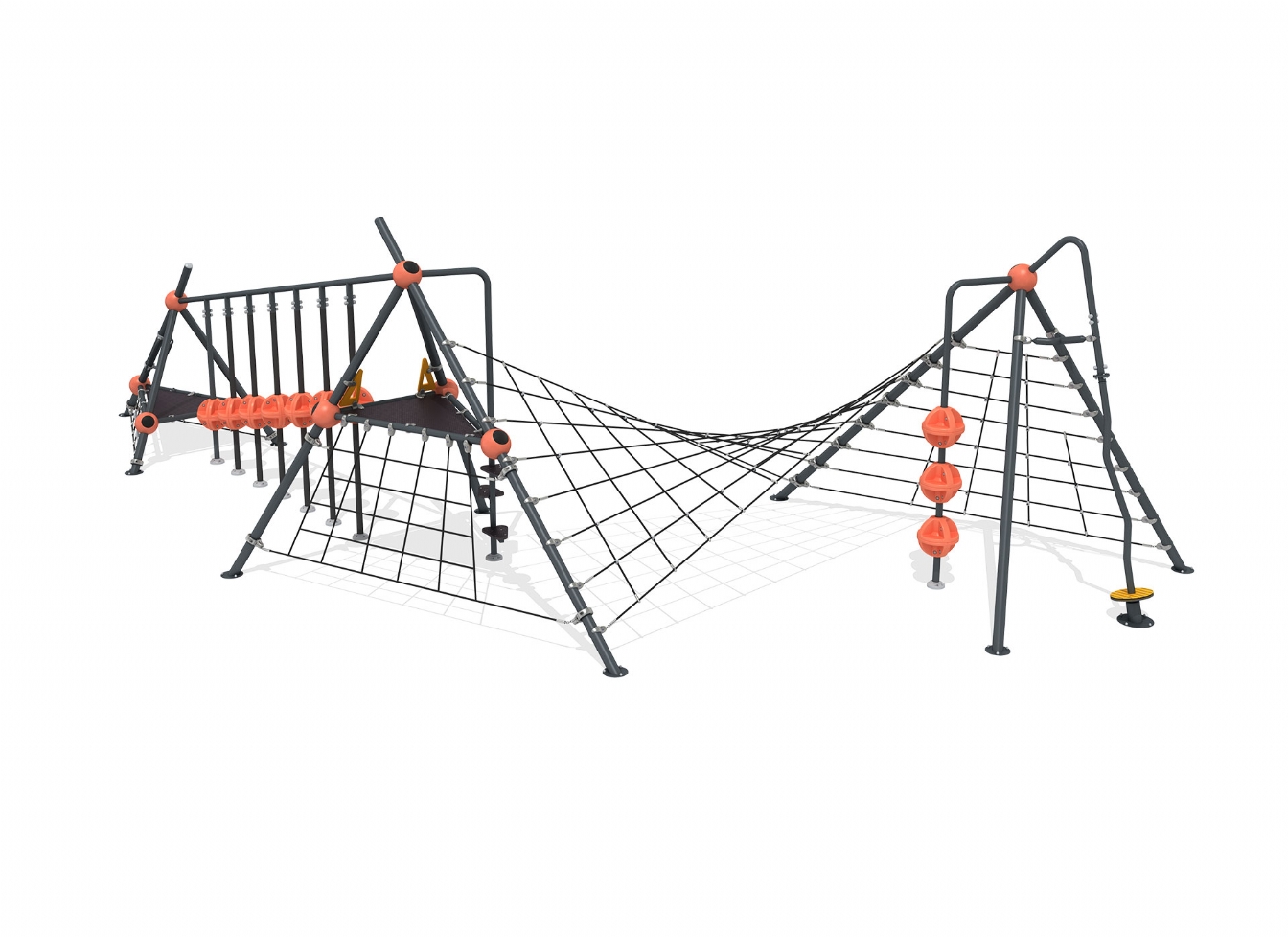 Lekställning Oruno i HDPE, HPL och stålvajer för offentlig miljö.