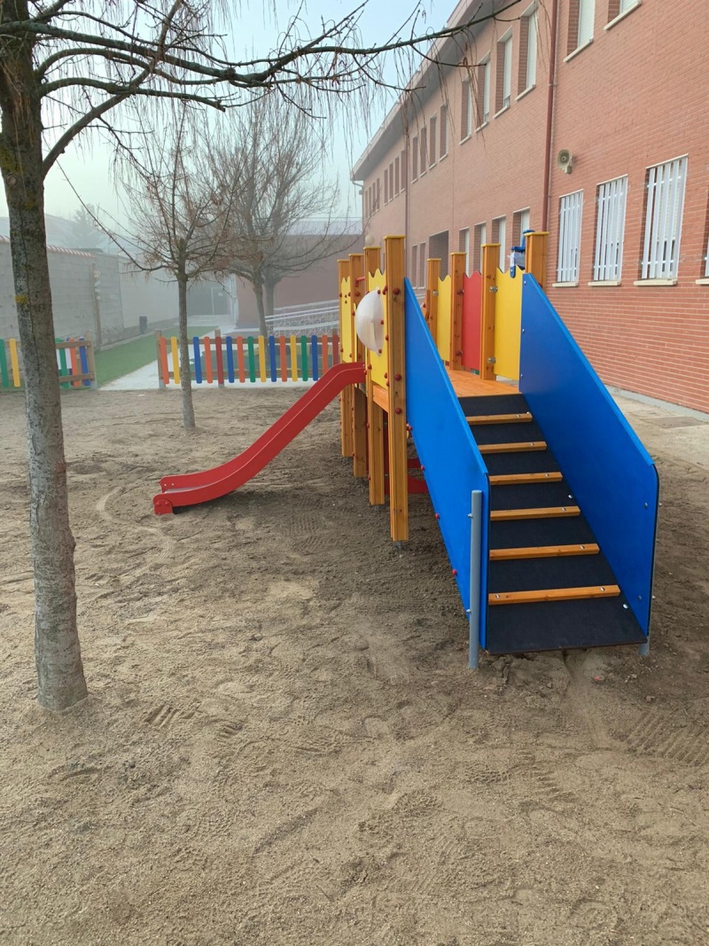 Lekställning för småbarn med lång plattform, ramp, rutschkana och lekfulla detaljer som uppmuntrar fantasi och rörelse.