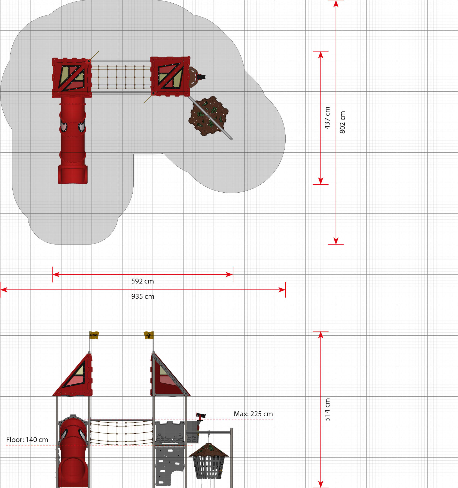 Lekställning Pelen är utvecklad för lekplatser där barn behöver varierade utmaningar i samma produkt. Den kombinerar lekvärde med robust konstruktion och uppmuntrar till klättring, balans och social lek. Produkten passar väl i förskola, skola och parkmiljö där hög användning ställer krav på kvalitet och driftsäkerhet. Mått (L x B x H): 592 cm x 437 cm x 498 cm. Max fallhöjd: 225 cm. Rekommenderad ålder: Från 3 år.