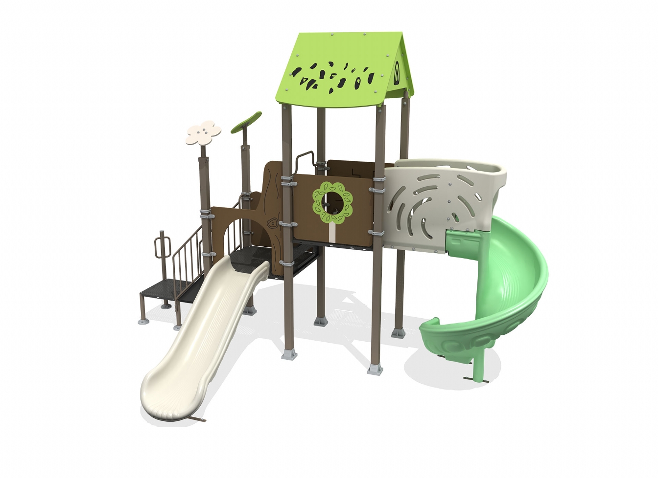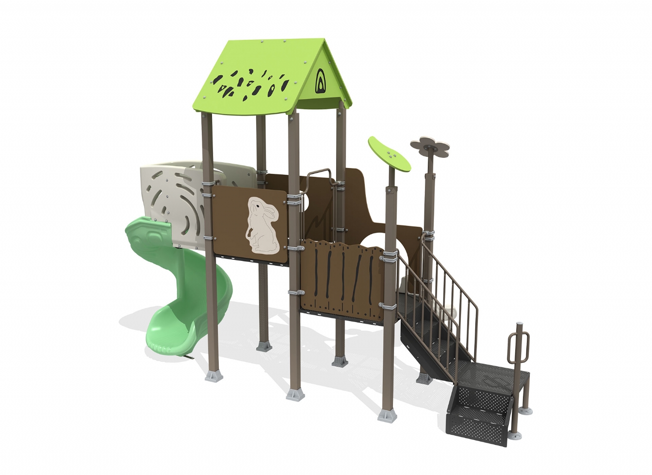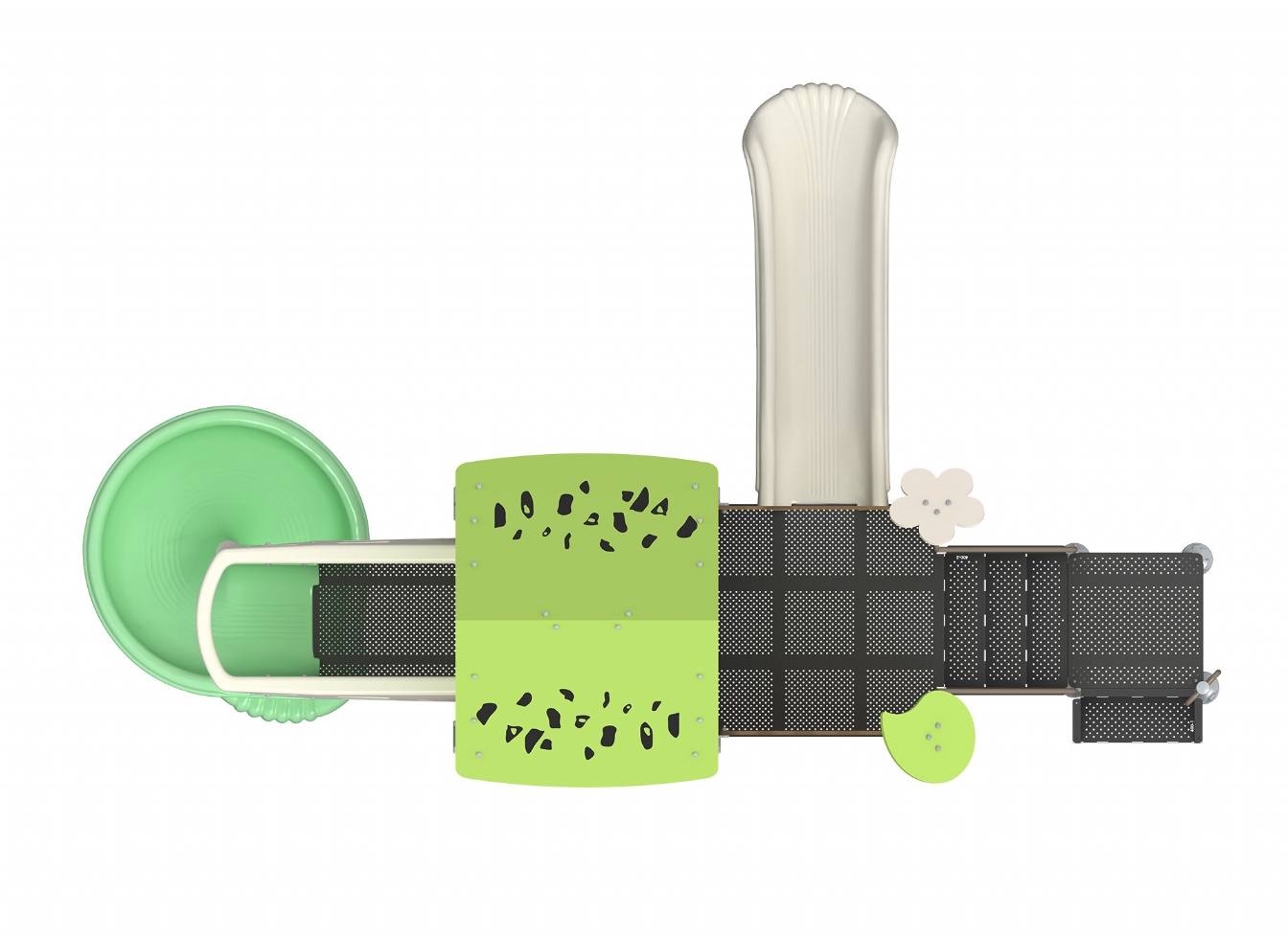 Lekställning Peleva i metallprofil, polykarbonat och marinplywood för offentlig miljö.