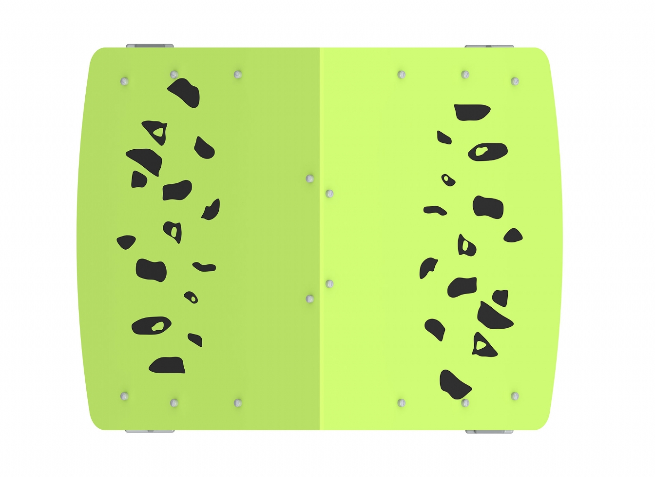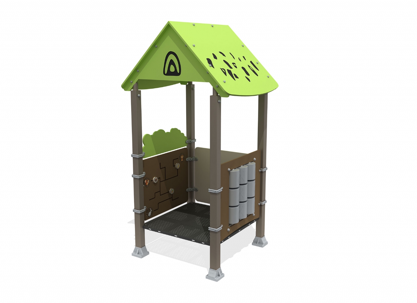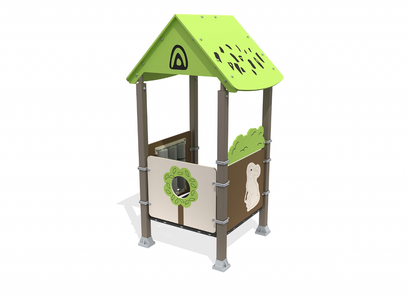 Lekställning Pelilo i metallprofil, polykarbonat och marinplywood för offentlig miljö.