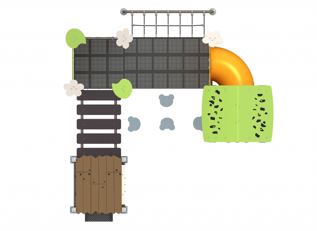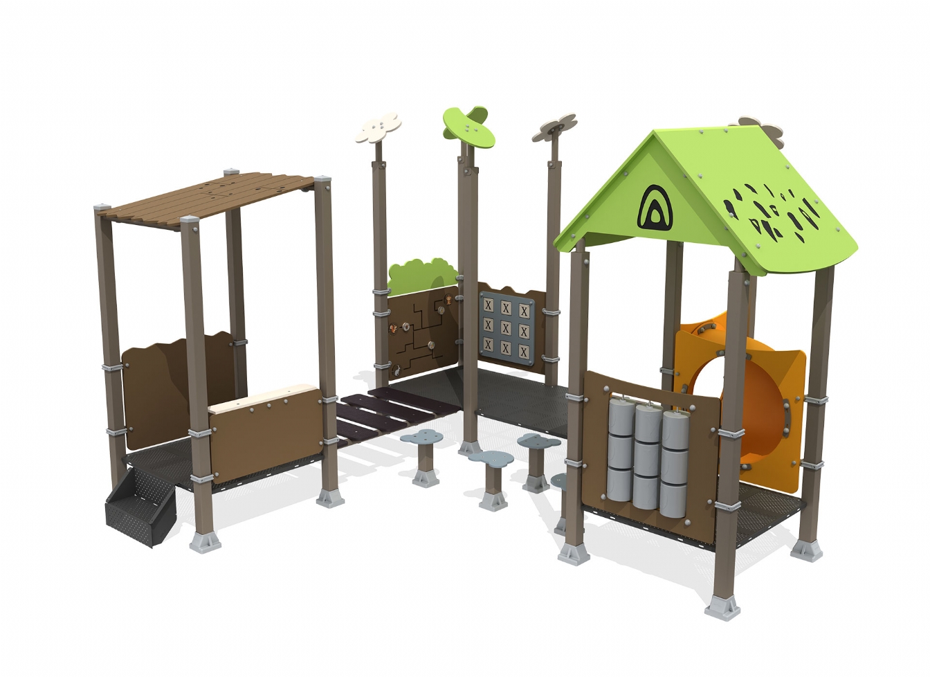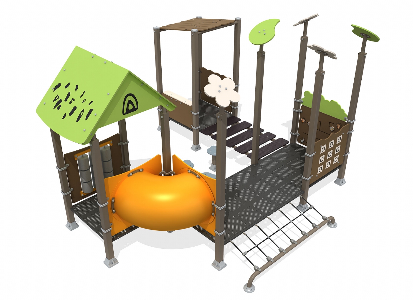 Lekställning Pelola i metallprofil, polykarbonat och marinplywood för offentlig miljö.