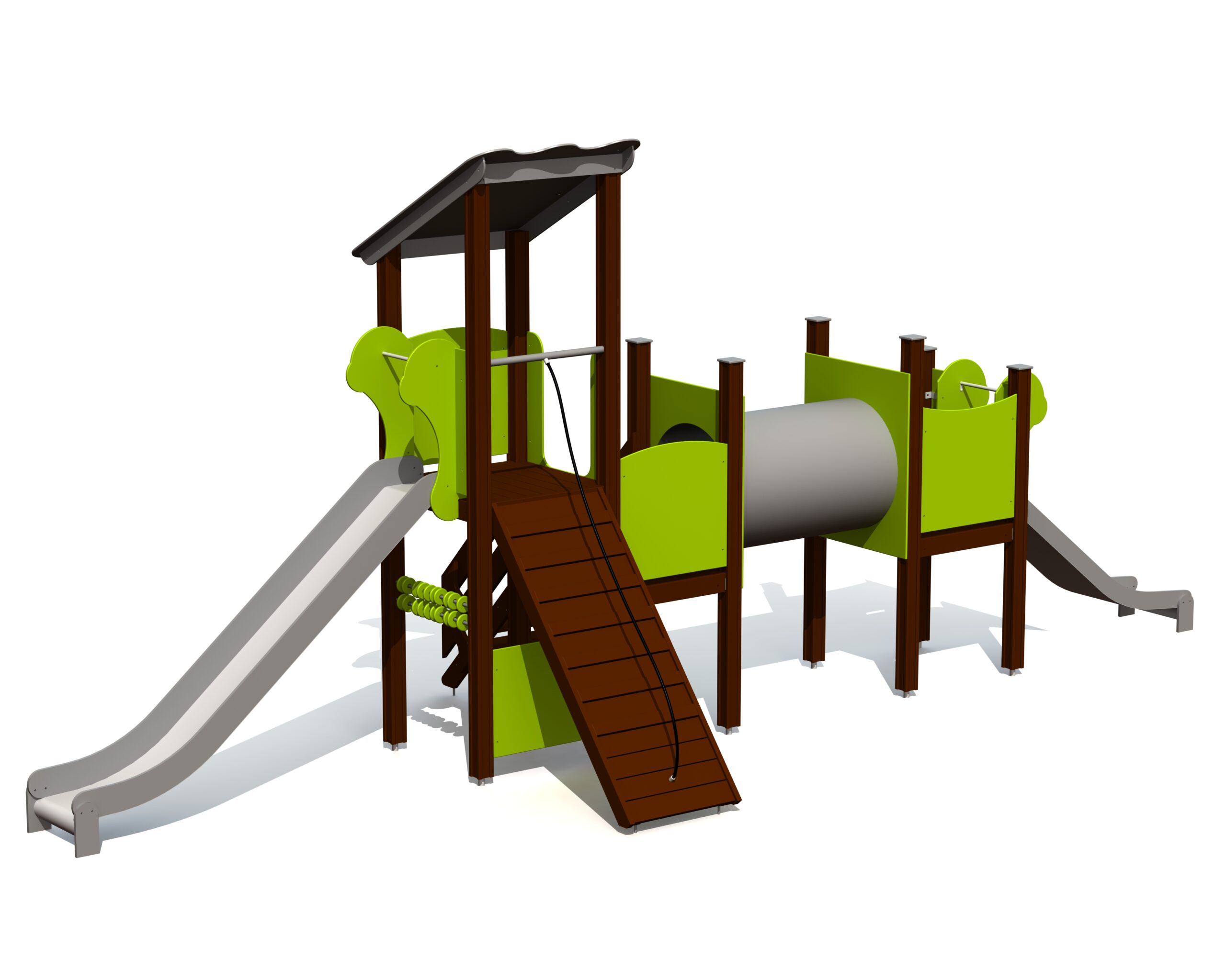 Lekcenter med tre plattformar, tunnel och två rutschkanor. Trappor med ledstänger leder till den nedre plattformen där en kryptunnel tar barnen till rutschkanan. En sluttande bro leder till den övre plattformen med tak och ytterligare rutschkana. Under den högre plattformen finns en kulram. Sidopanelerna kan anpassas med aktivitets- eller temapaneler.