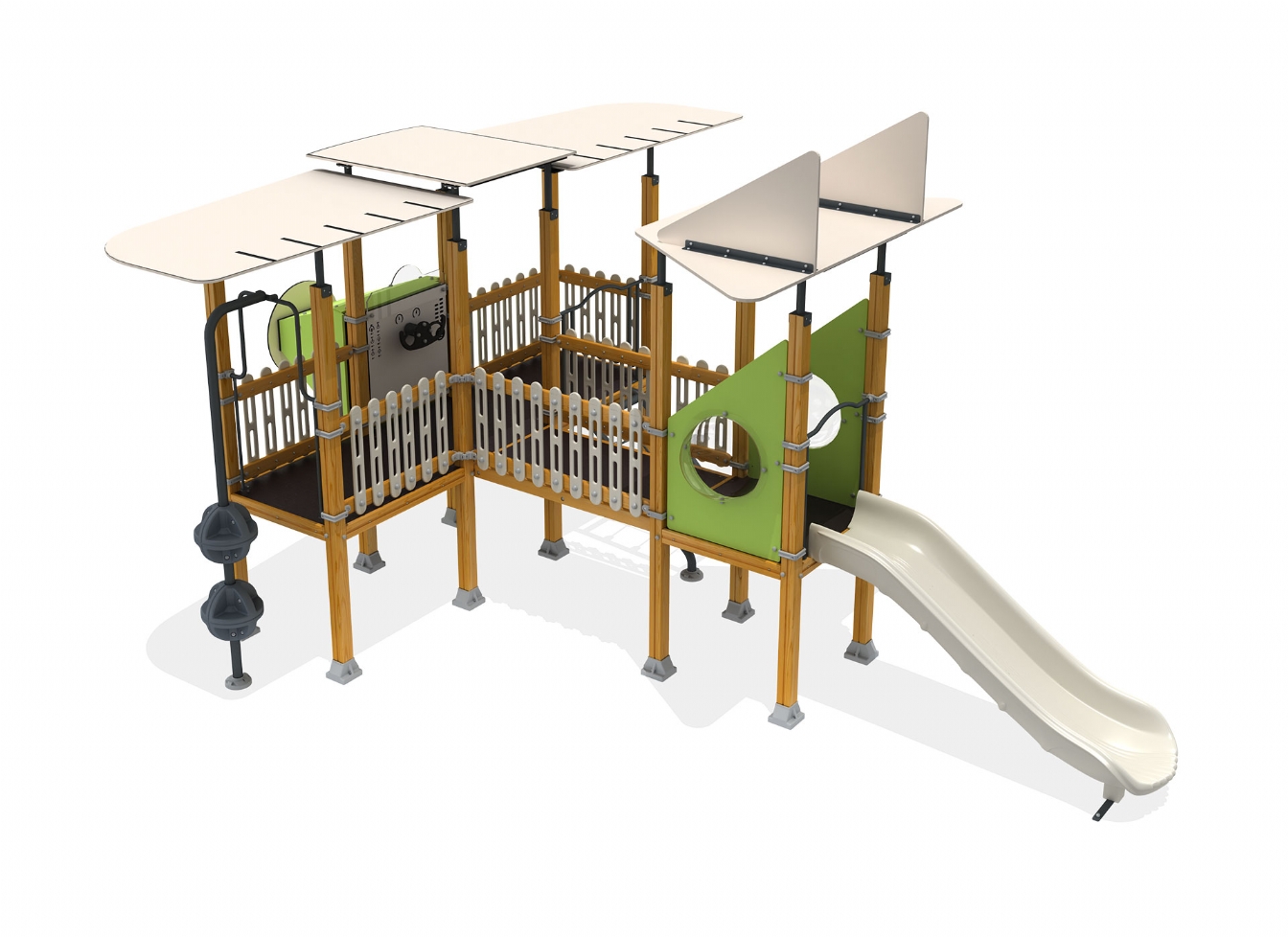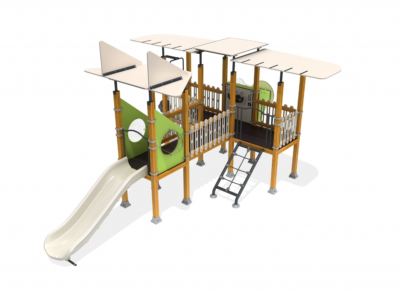 Lekställning Raleno är utvecklad för lekplatser, skolor, förskolor och andra offentliga utemiljöer. Produkten har bredd 636 cm, djup 520 cm och höjd 344 cm. Specifikationen omfattar rutschhöjd 100 cm. Utförandet i metallprofil, marinplywood, träen och gummi ger en tålig konstruktion som lämpar sig för återkommande användning i krävande miljöer. Den är anpassad för upp till 15 barn och rekommenderad ålder 3-12.