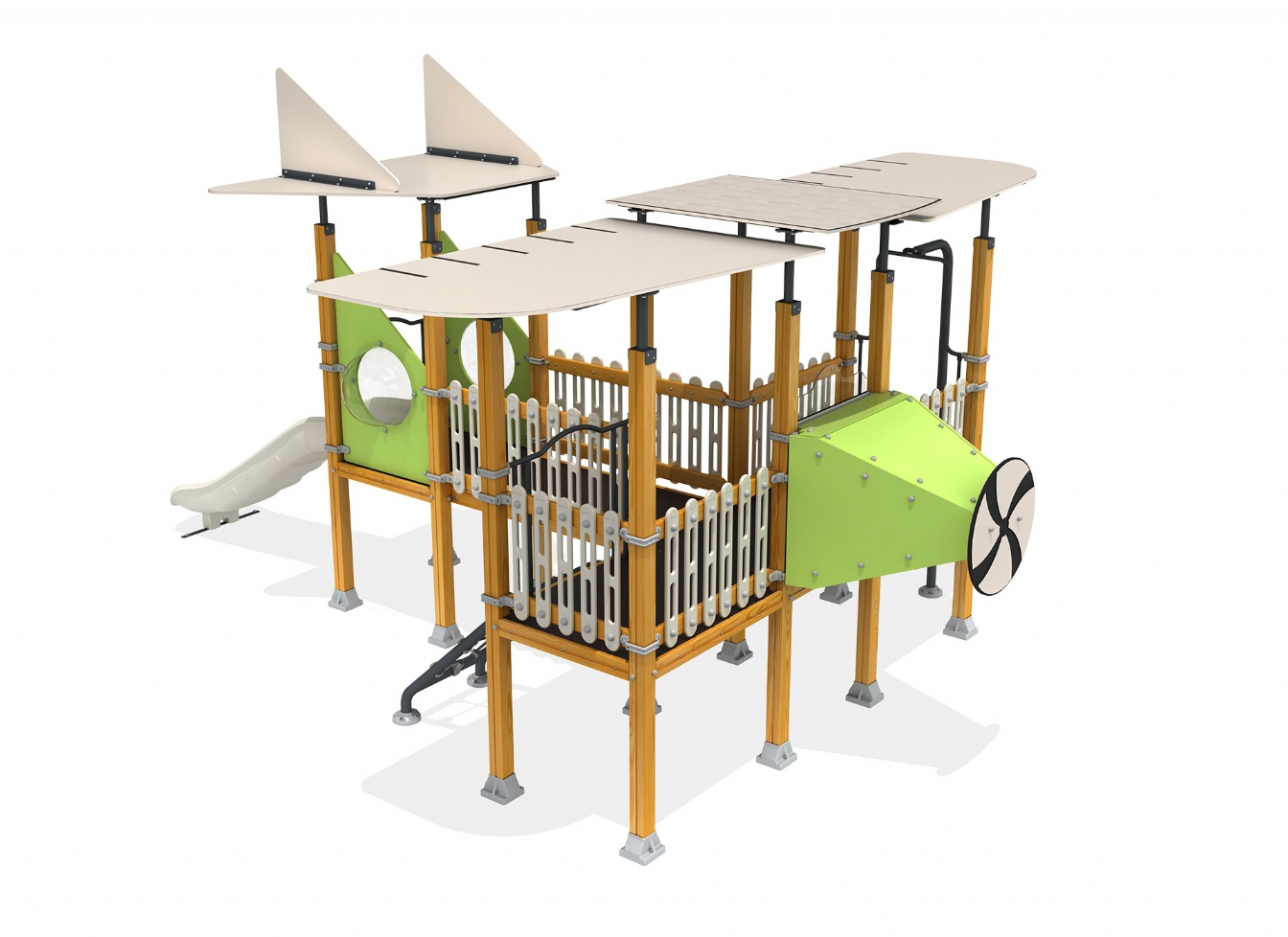 Lekställning Raleno i metallprofil, marinplywood och träen för offentlig miljö.