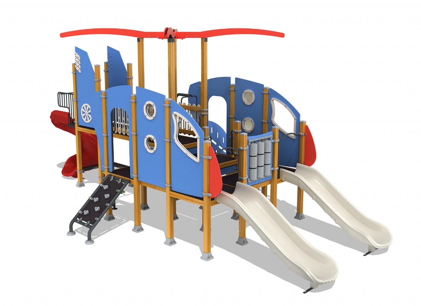 Lekställning Raleva i metallprofil, marinplywood och träen för offentlig miljö.