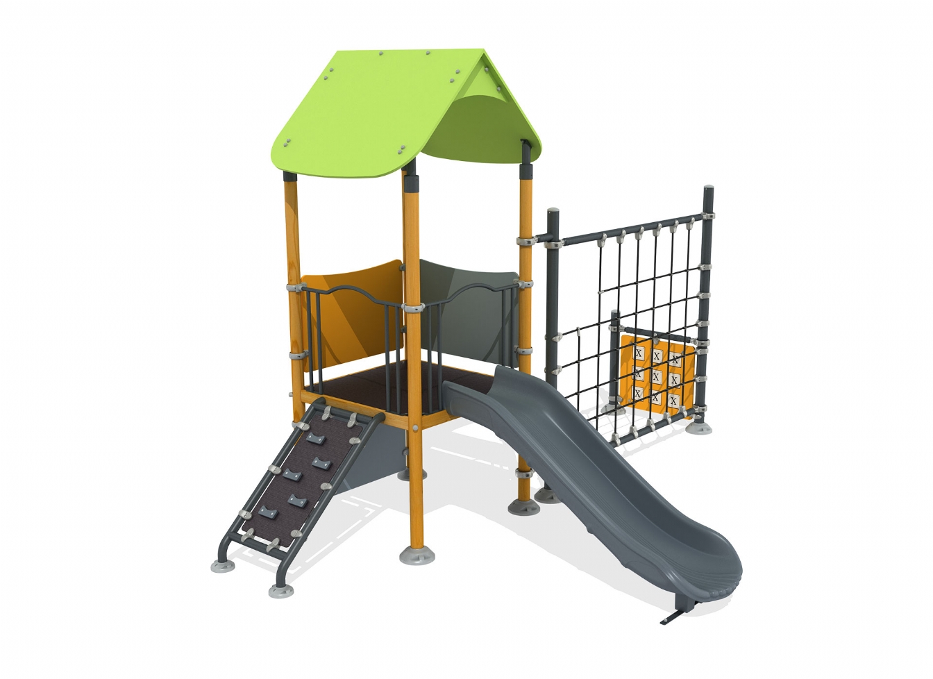 Lekställning Selia är utvecklad för lekplatser, skolor, förskolor och andra offentliga utemiljöer. Produkten har bredd 494 cm, djup 327 cm och höjd 350 cm. Specifikationen omfattar säkerhetszon L 783 x W 626 samt rutschhöjd 100 cm. Utförandet i HDPE, HPL, impregnerad furu och plywood ger en tålig konstruktion som lämpar sig för återkommande användning i krävande miljöer. Den är anpassad för upp till 10 barn och rekommenderad ålder 3-12.