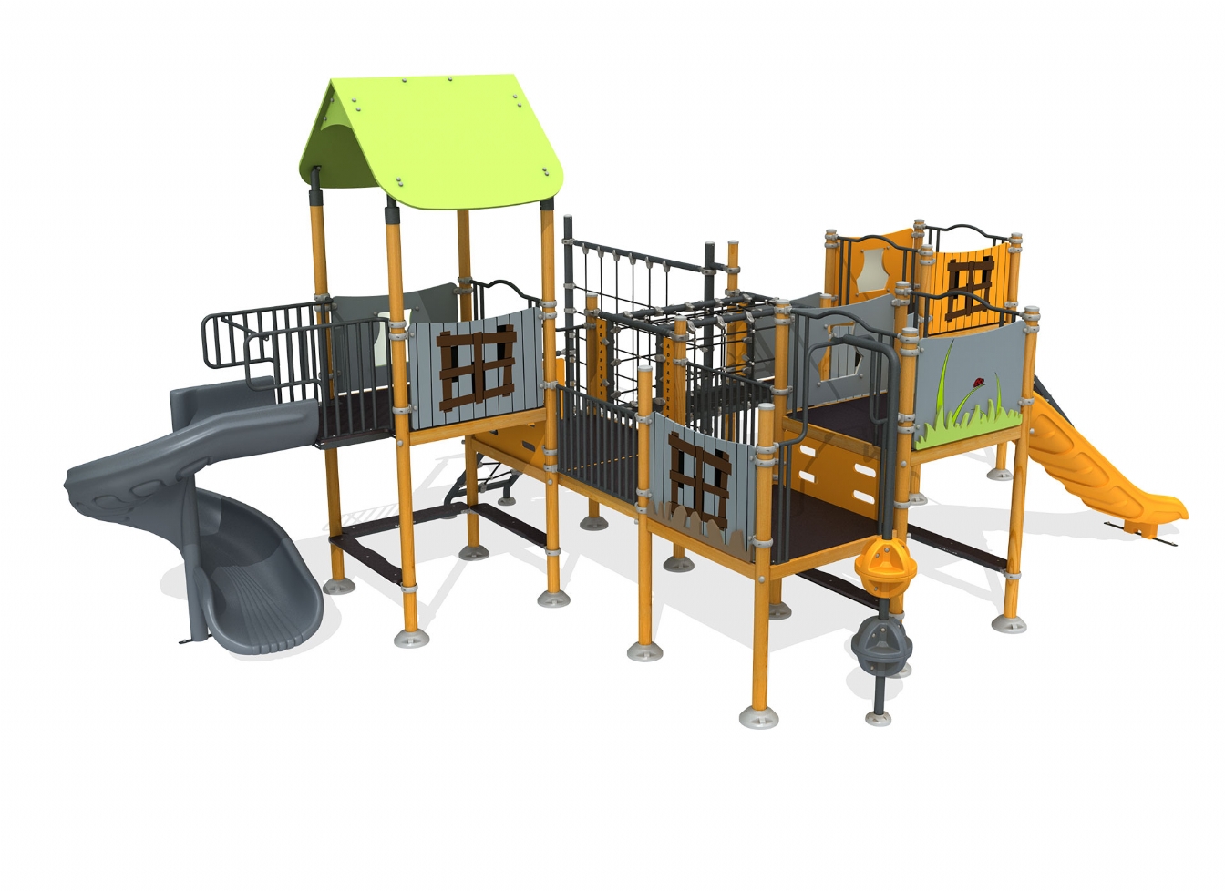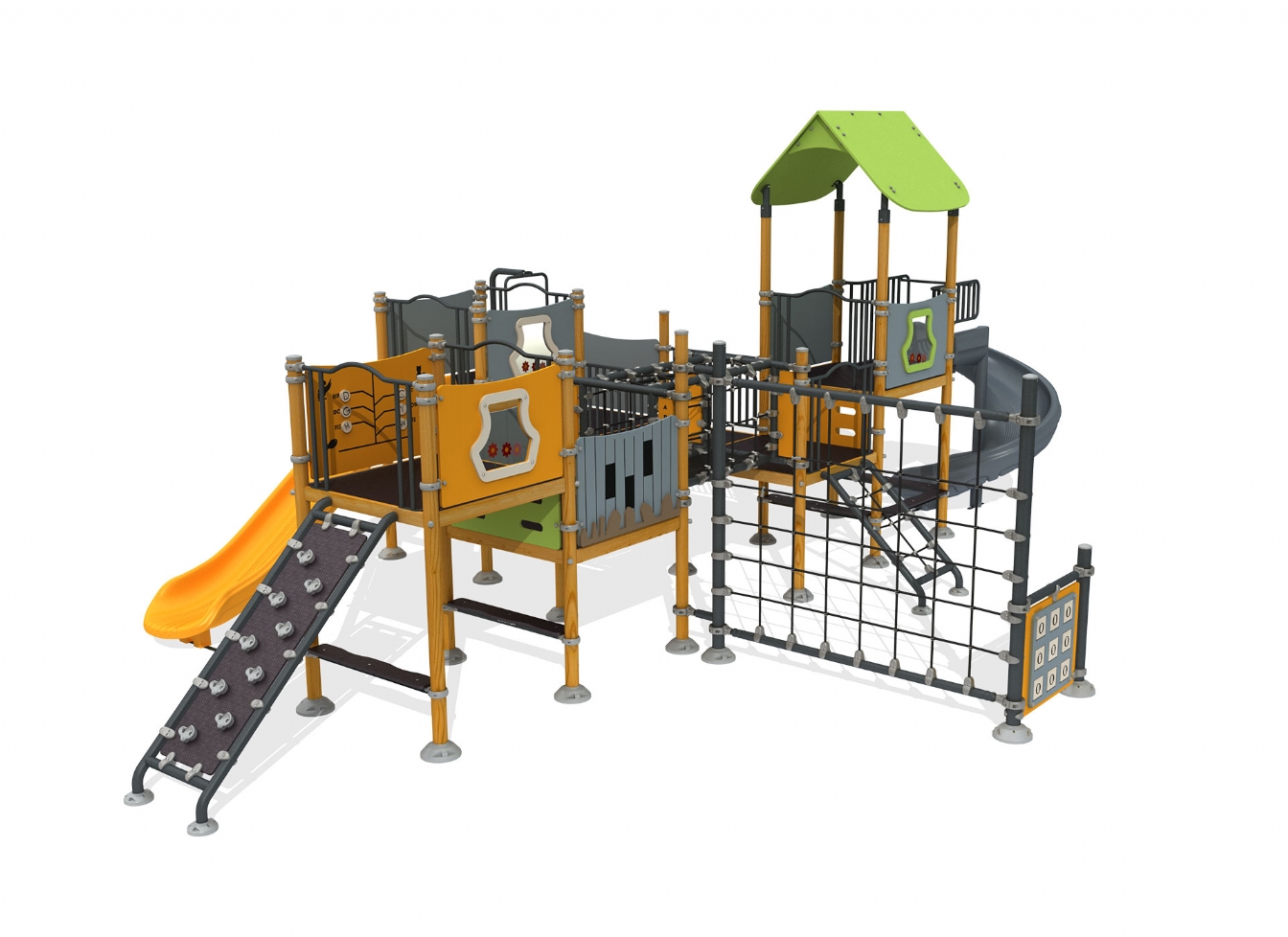 Lekställning Selor är utvecklad för lekplatser, skolor, förskolor och andra offentliga utemiljöer. Produkten har bredd 954 cm, djup 684 cm och höjd 390 cm. Specifikationen omfattar säkerhetszon L 1245 x W 965 samt rutschhöjd 150 cm. Utförandet i HDPE, HPL, impregnerad furu och plywood ger en tålig konstruktion som lämpar sig för återkommande användning i krävande miljöer. Den är anpassad för upp till 27 barn och rekommenderad ålder 3-12.