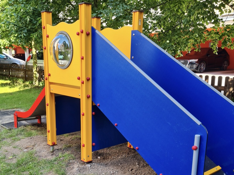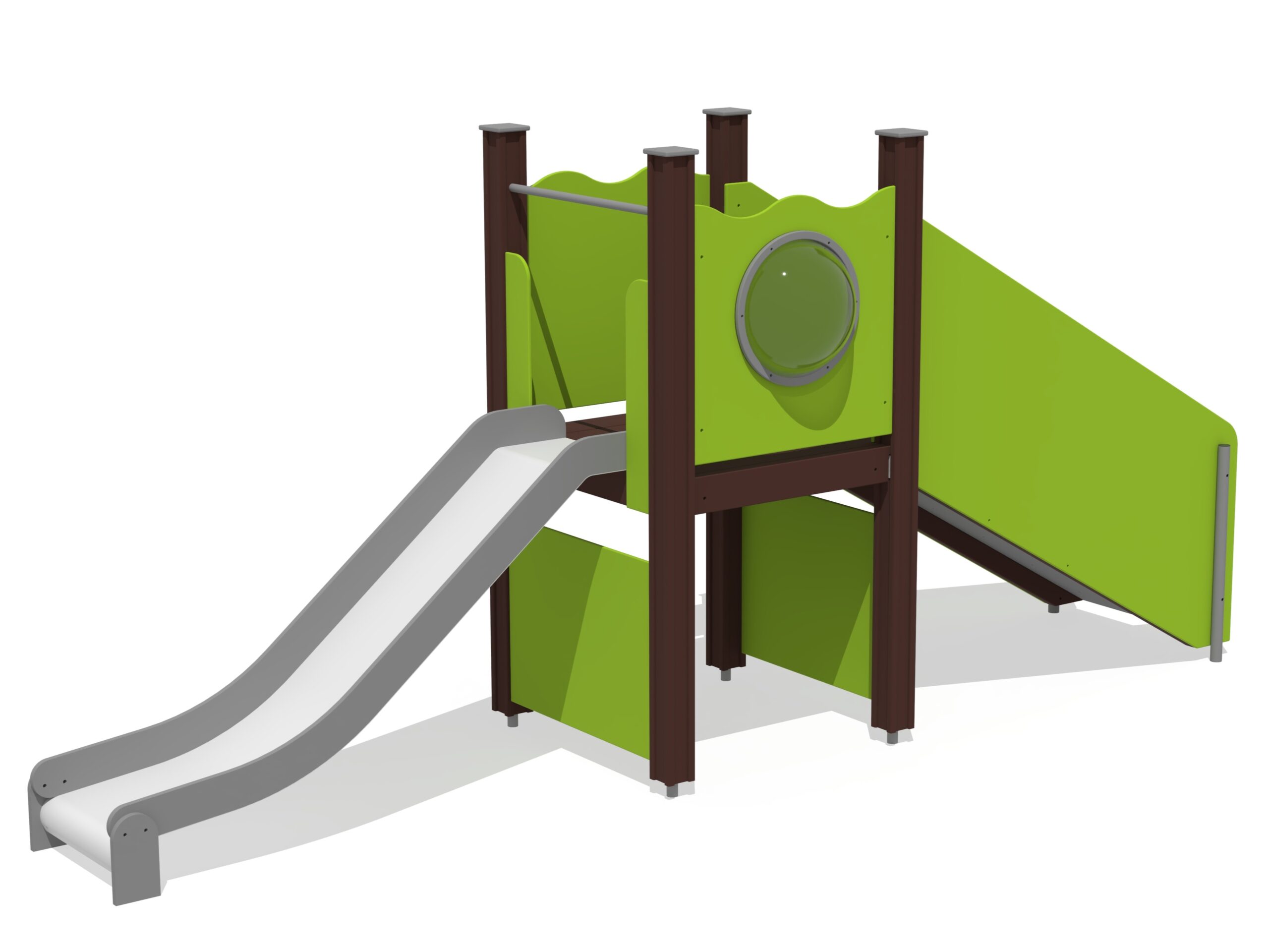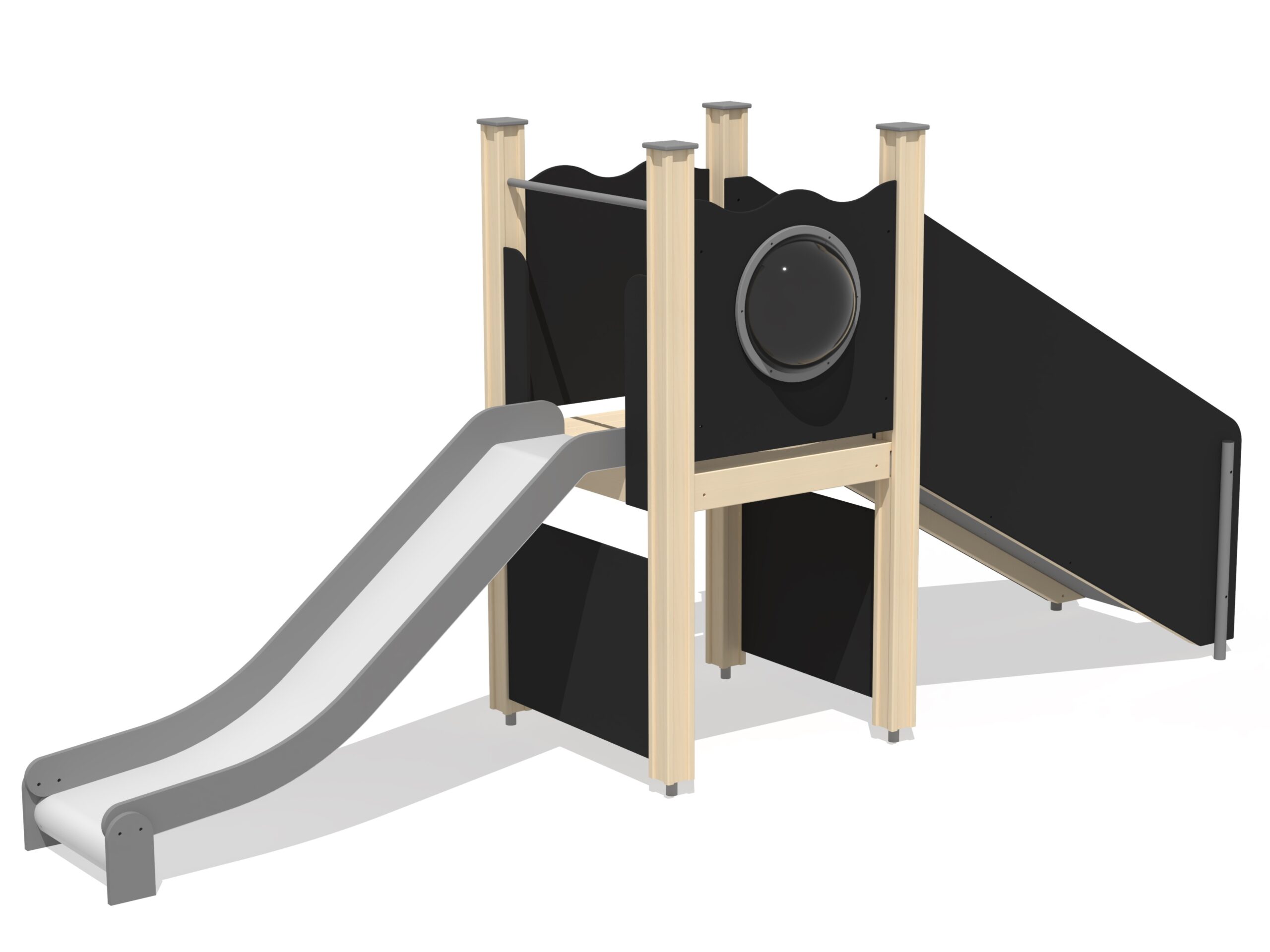 Lekställning Tim är en rutschkana för småbarn som nås via en 1,75 meter lång ramp med trästeg. Rampen gör lekställningen lättillgänglig och passar barn som behöver extra stöd vid klättring. Konstruktionen uppmuntrar till trygg rörelselek och utveckling av balans och motorik i tidig ålder.