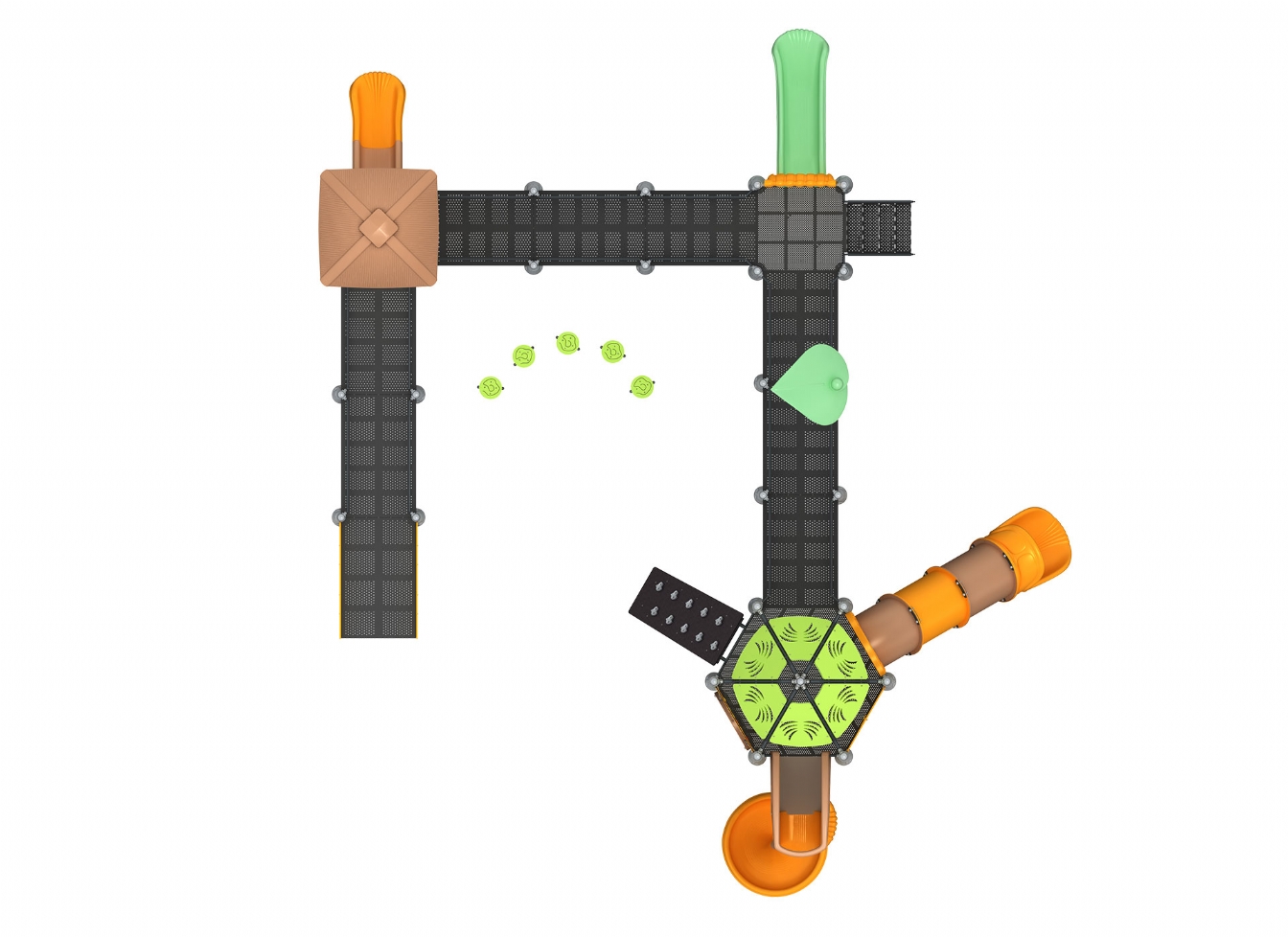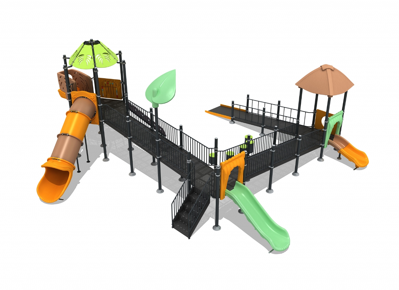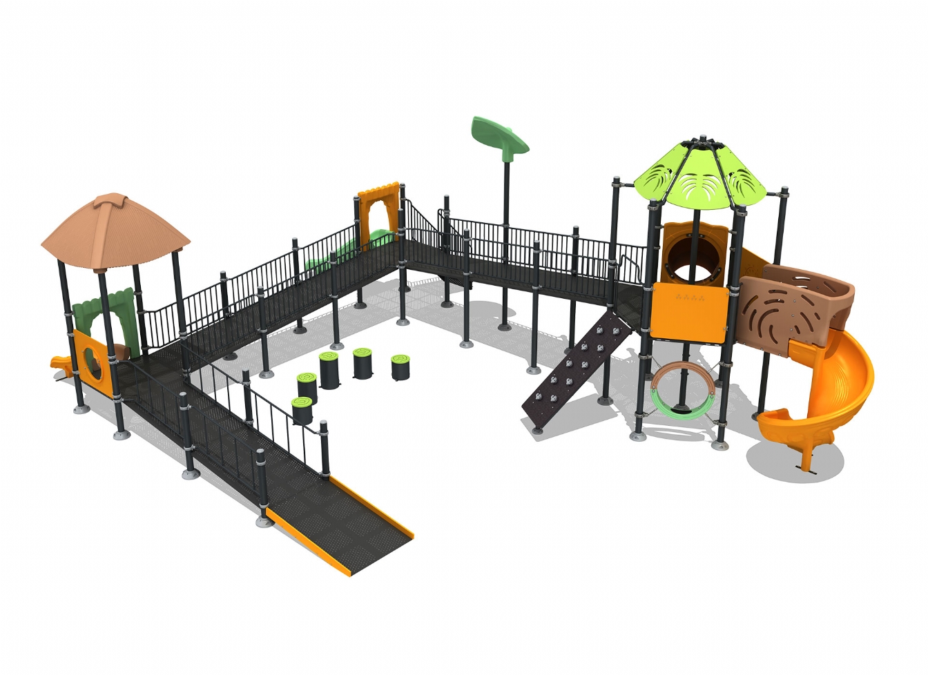 Lekställning Torola i metallprofil, polykarbonat och marinplywood för offentlig miljö.