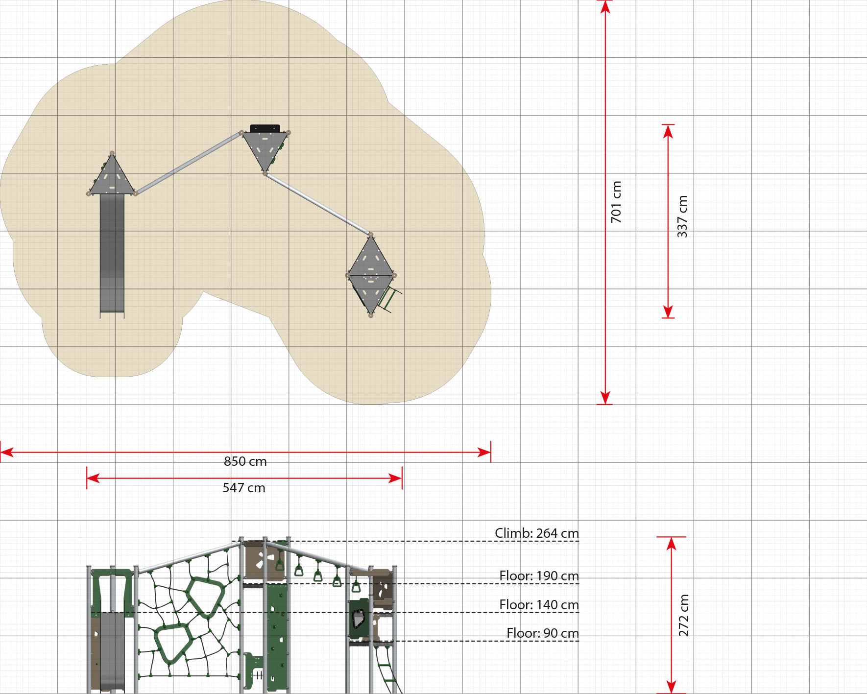 Lekställning Viria är utvecklad för lekplatser där barn behöver varierade utmaningar i samma produkt. Den kombinerar lekvärde med robust konstruktion och uppmuntrar till klättring, balans och social lek. Produkten passar väl i förskola, skola och parkmiljö där hög användning ställer krav på kvalitet och driftsäkerhet. Mått (L x B x H): 547 cm x 337 cm x 272 cm. Max fallhöjd: 264 cm. Rekommenderad ålder: Från 4 år.