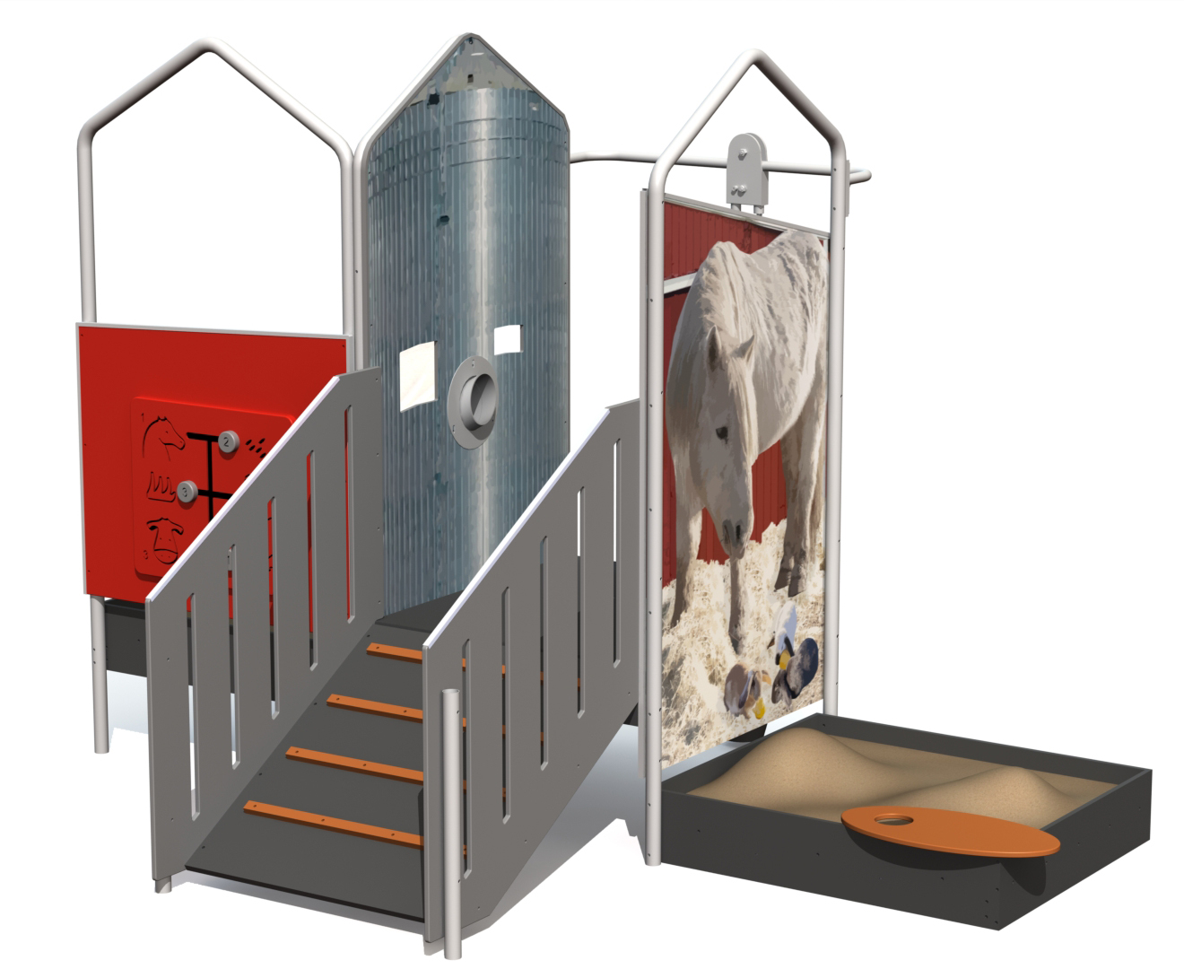 Lekställning i FARMLIFE-serien för offentlig utemiljö med gårdstema som kombinerar rollekar, klättring och sandlek.