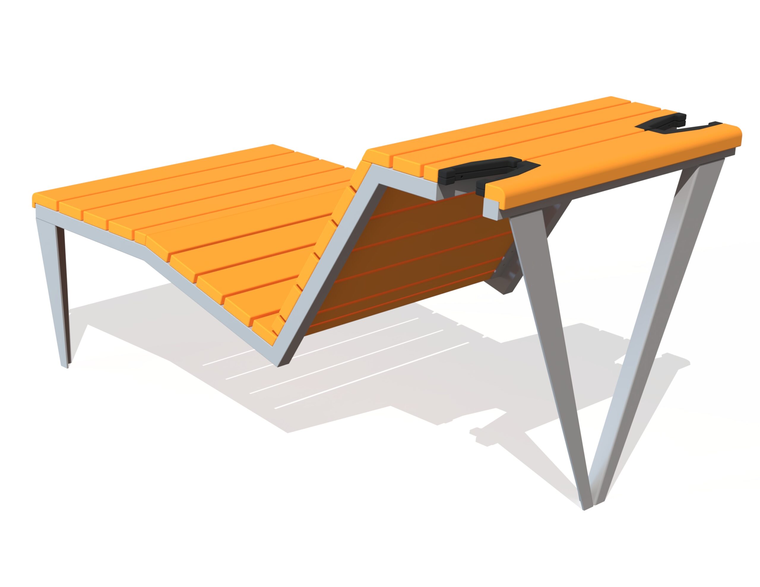 Liggbänk Cykel Duo kombinerar en loungeinspirerad vilobänk med praktiskt cykelställ i samma enhet. Modellen är utvecklad för moderna urbana miljöer, parker, stränder och rekreationsytor där man vill förena vistelse och cykelparkering på liten yta. Konstruktionen består av stålram och träytor som ger en robust och varm helhet i offentlig miljö. Den liggande formen erbjuder en tydlig plats för paus, medan cykelhållarna gör lösningen funktionell även för besökare som anländer med cykel. En smart hybridmöbel för projekt där design, funktion och effektiv ytanvändning behöver gå hand i hand. Produkten är utvecklad för regelbunden användning i offentlig utemiljö och ger stabil funktion över tid.