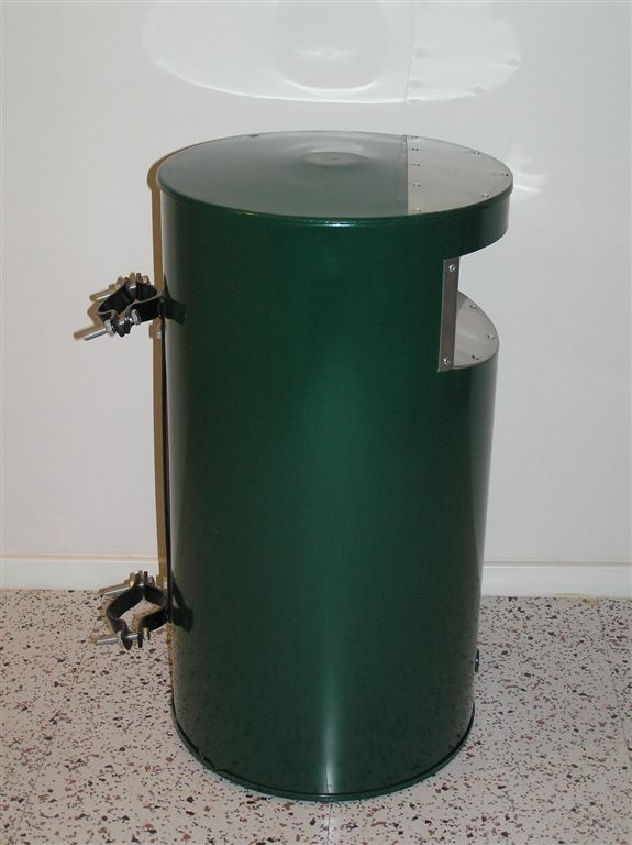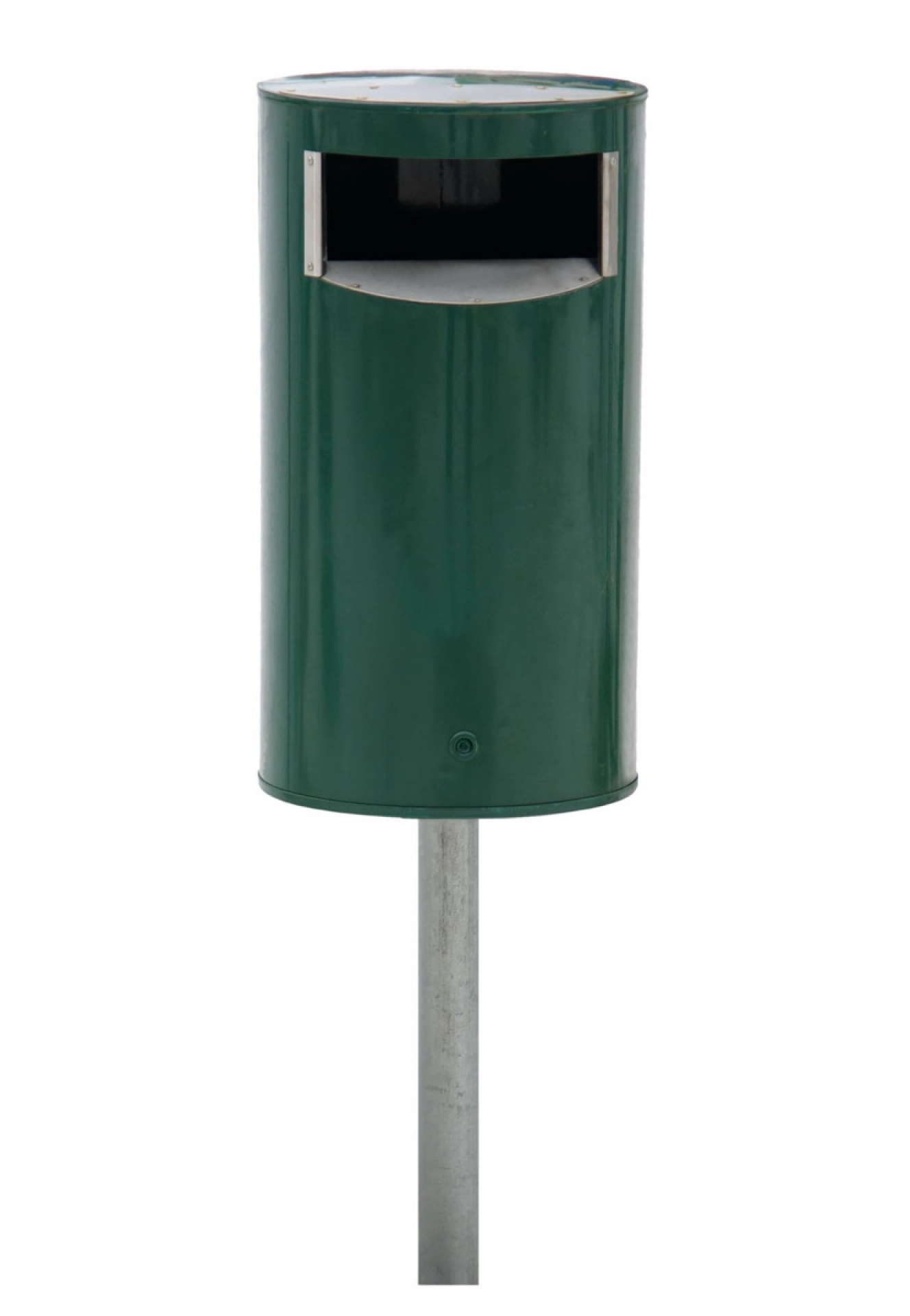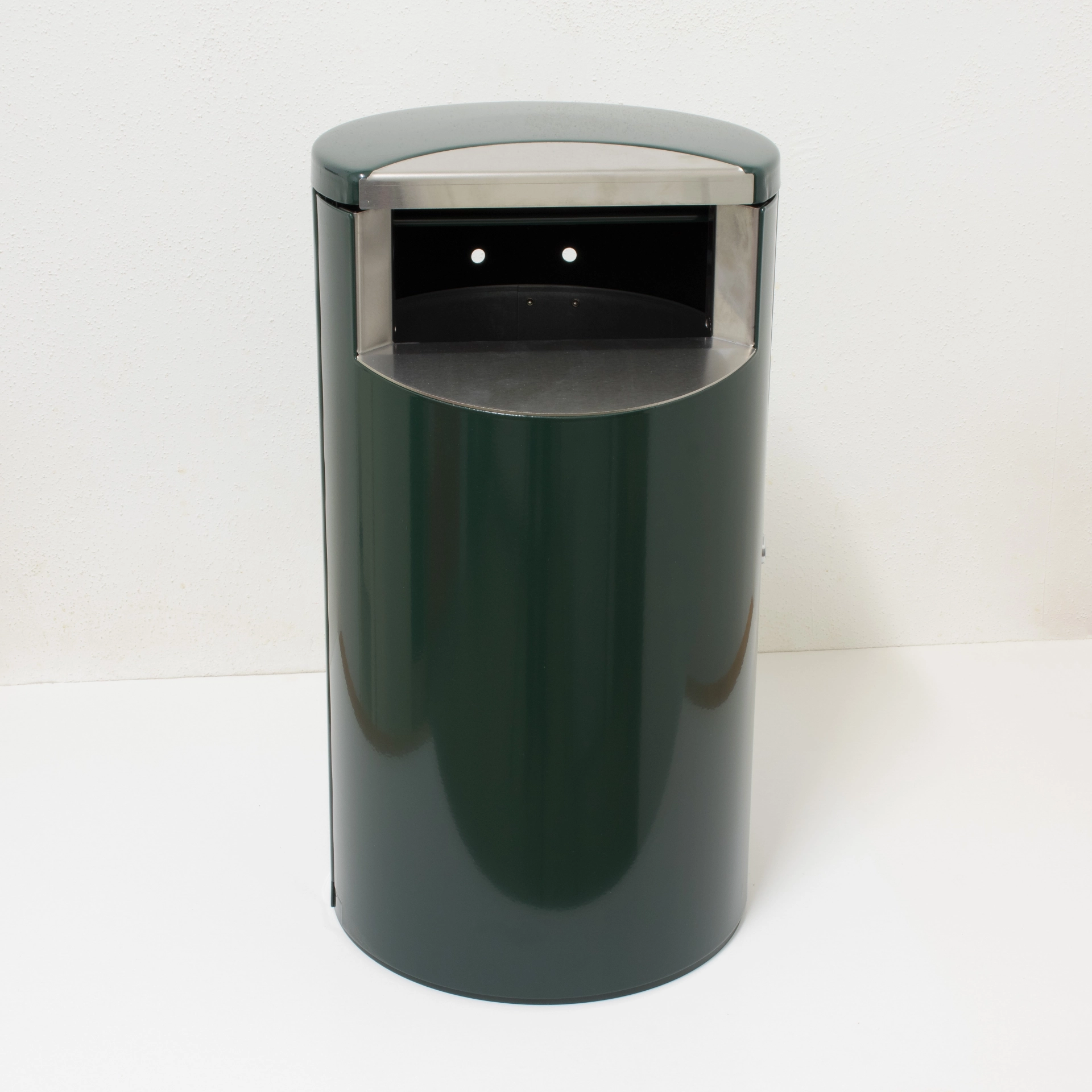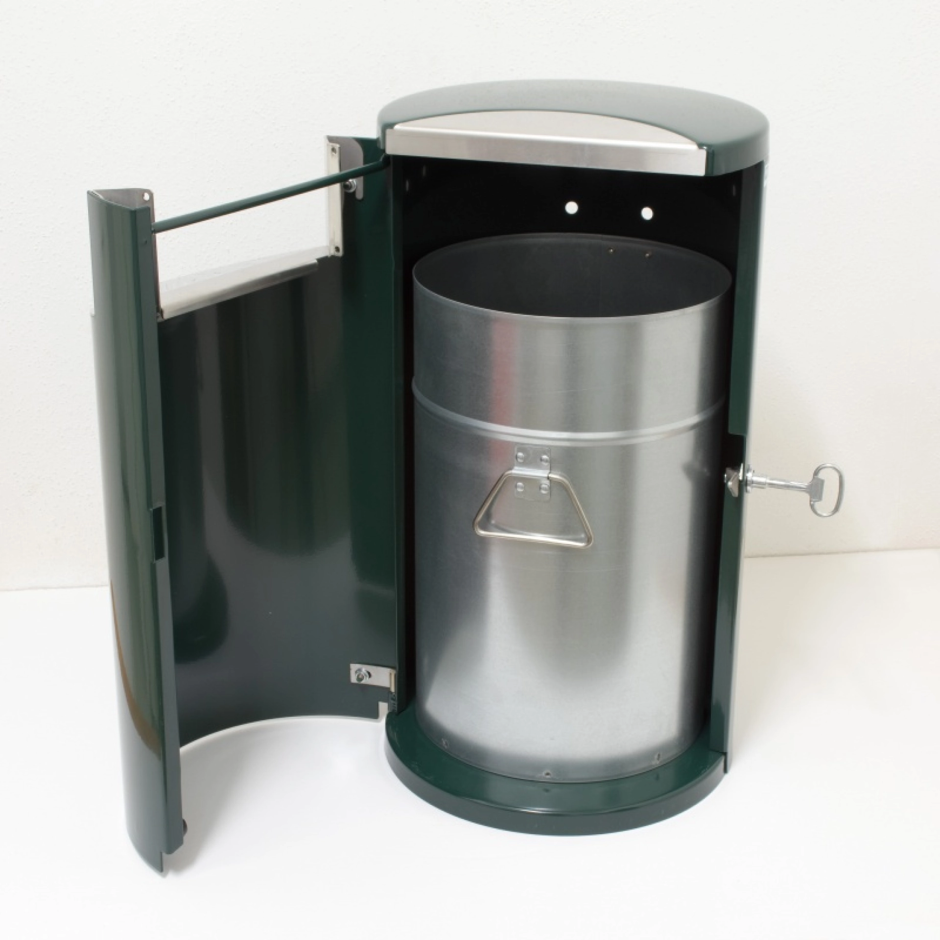 30L papperskorg i pulverlackerad stålplåt med öppning i rostfritt stål. Kan monteras på vägg eller gjutas i mark. Finns i grått eller grönt.