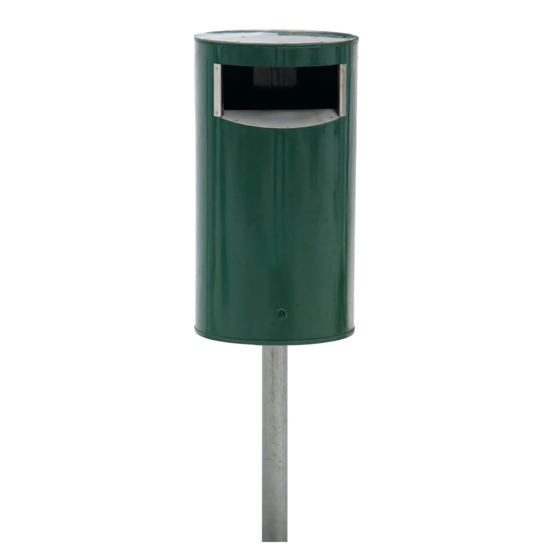 30L papperskorg i pulverlackerad stålplåt med öppning i rostfritt stål. Kan monteras på vägg eller gjutas i mark. Finns i grått eller grönt.