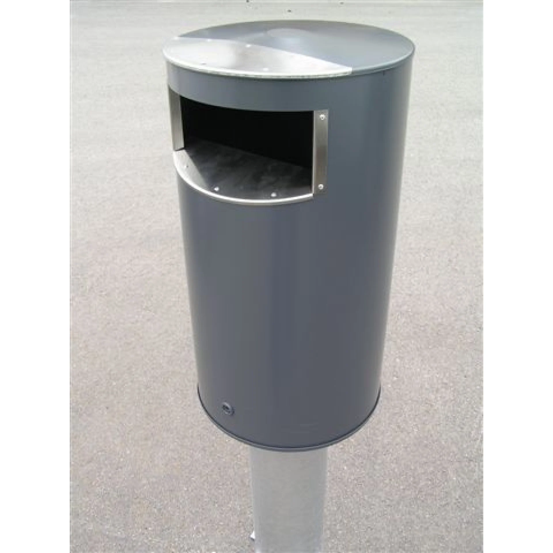 60L papperskorg i stålplåt med öppning i rostfritt stål. Tömning framifrån. Finns i grått eller grönt.
