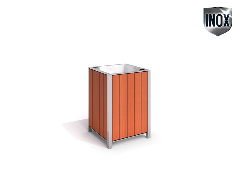 Papperskorg rostfritt stål 02 för park- och stadsmiljö med hållbar konstruktion, funktionell design och låg skötselnivå i daglig drift. Material: rostfritt stål och trä.