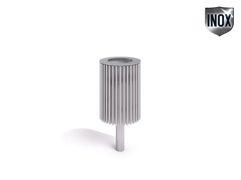 Papperskorg rostfritt stål 05 för park- och stadsmiljö med hållbar konstruktion, funktionell design och låg skötselnivå i daglig drift. Material: rostfritt stål.
