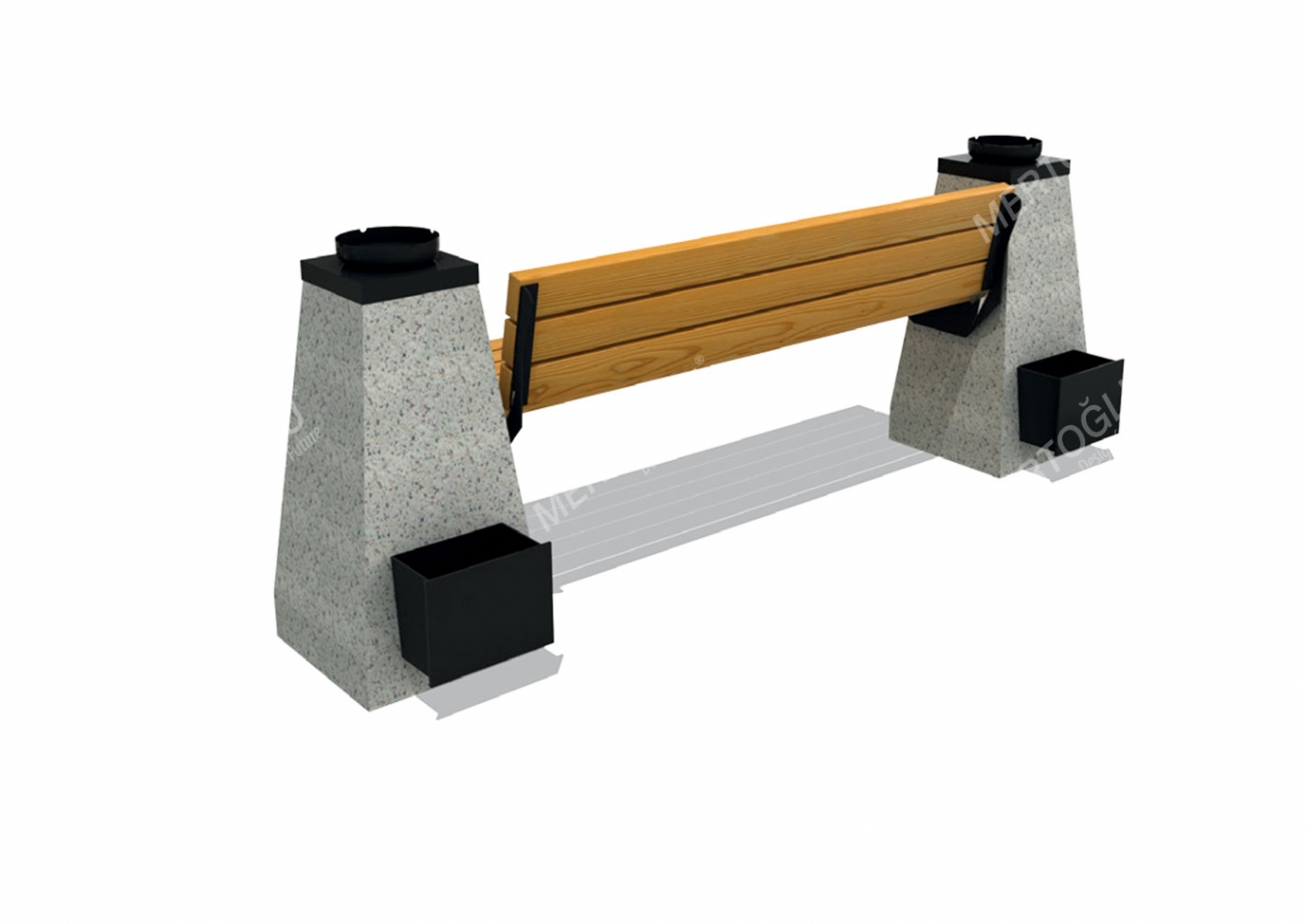 Parkbänk Alira i betongblock, plåt och impregnerad furu för offentlig miljö.