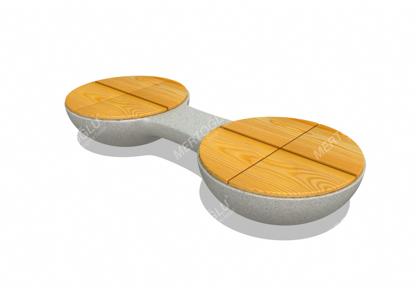 Parkbänk Aran i betongblock, plåt och impregnerad furu för offentlig miljö.
