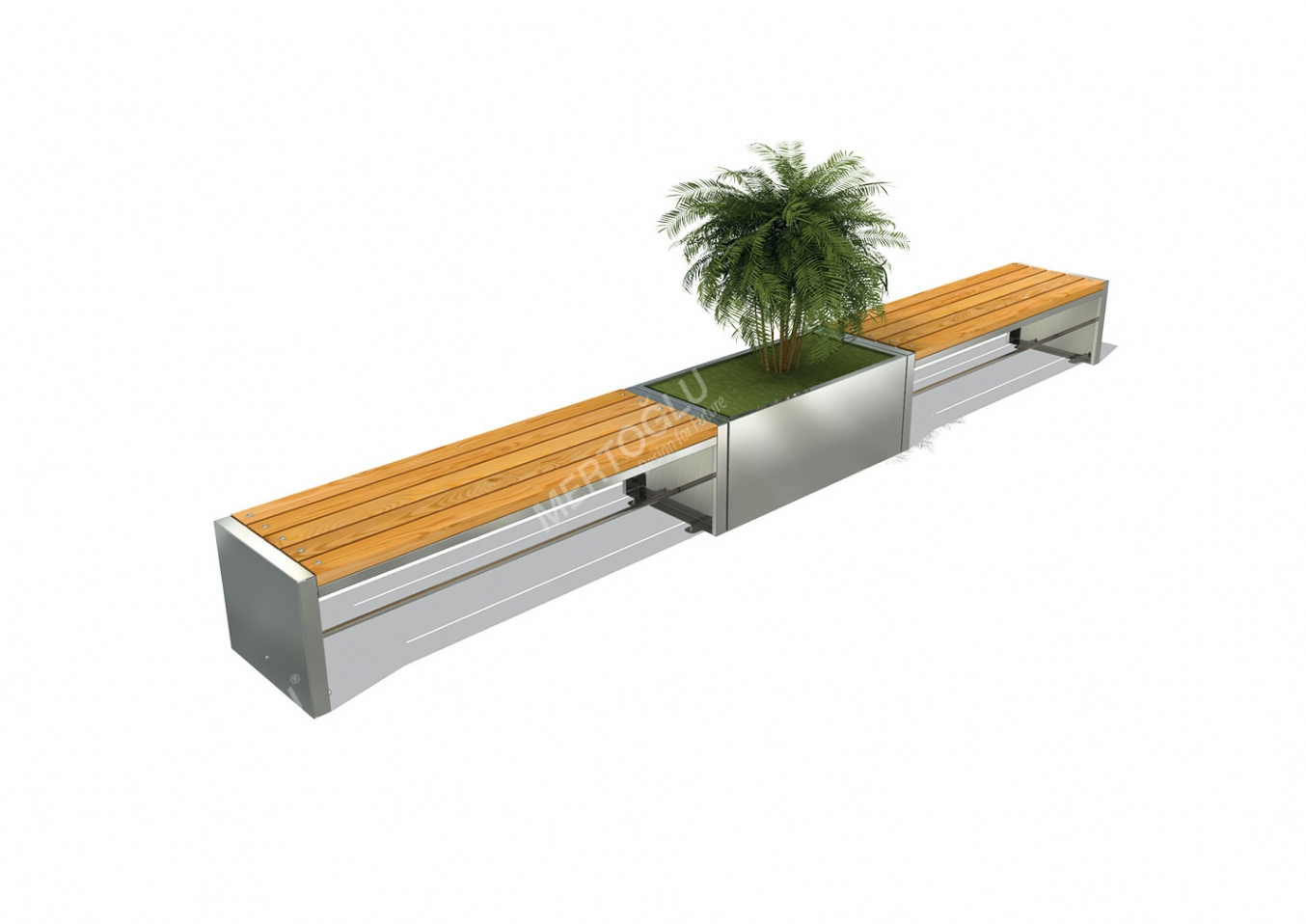 Parkbänk Belula i rostfritt stål metall och impregnerad furu för offentlig miljö.