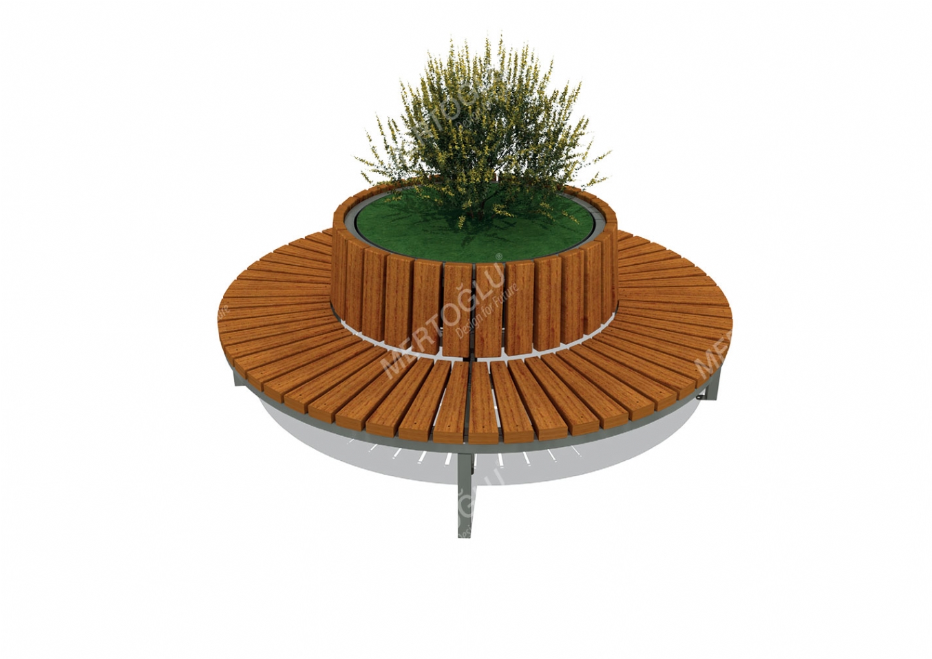 Parkbänk Biria i rostfri plåt och iroko för offentlig miljö.