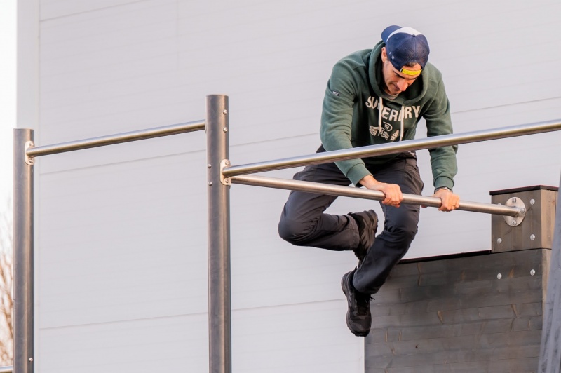Parkourstruktur där väggelementen är tillverkade av hållbart korslaminerat trä (CLT) för hög stabilitet och lång livslängd trots varierande luftfuktighet. Träet har behandlats i en fyrastegsprocess för väderbeständighet. Väggelementens övre kanter är täckta med gummibelagd halkskyddsplast i färgalternativen grå eller röd. Horisontella rör är av rostfritt stål och vertikala stolpar av varmförzinkat och pulverlackerat stål. Konstruktionen är avsedd för ytmontering, exempelvis på 150 mm armerad betongplatta. Markfästen är tillverkade av varmförzinkad metall.