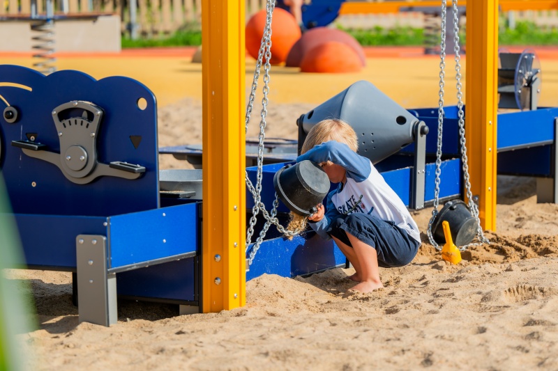 Multifunktionellt sandlekskomplex för småbarn bestående av sex sandlådor. Komplexet innehåller två roterande sandkvarnar, en tratt med propp, en roterande sandsil, en ramp för att flytta sand mellan sandlådor, en sandvåg för vägning av sandkakor samt ratt- och knappspel. Två sandbord ingår, ett med hål och ett utan. Produkten placeras direkt på marken utan förankring, gjutning eller fastsättning.