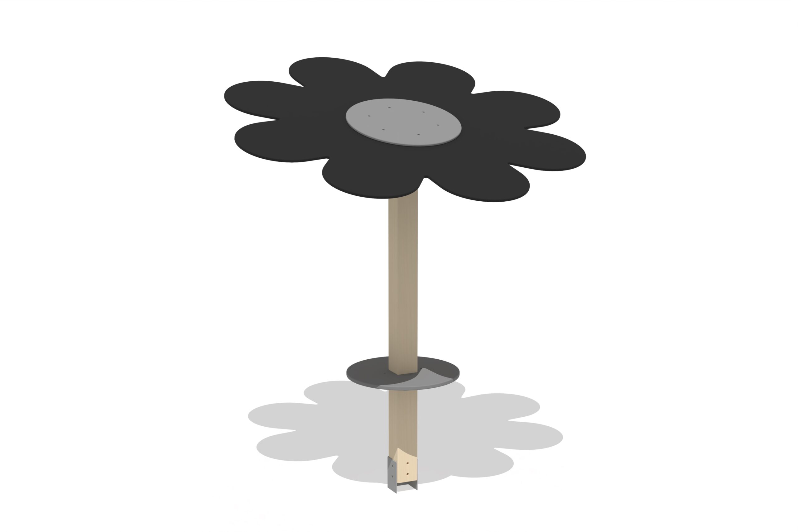 Sandlådeskugga BLOMMA som ger skydd mot både solens strålar och regn. Det runda bordet runt stolpen fungerar som avställningsyta för leksaker eller sandkreationer. Stolpen i laminerat trä är nedgjuten i betong och fäst med varmförzinkade beslag.
