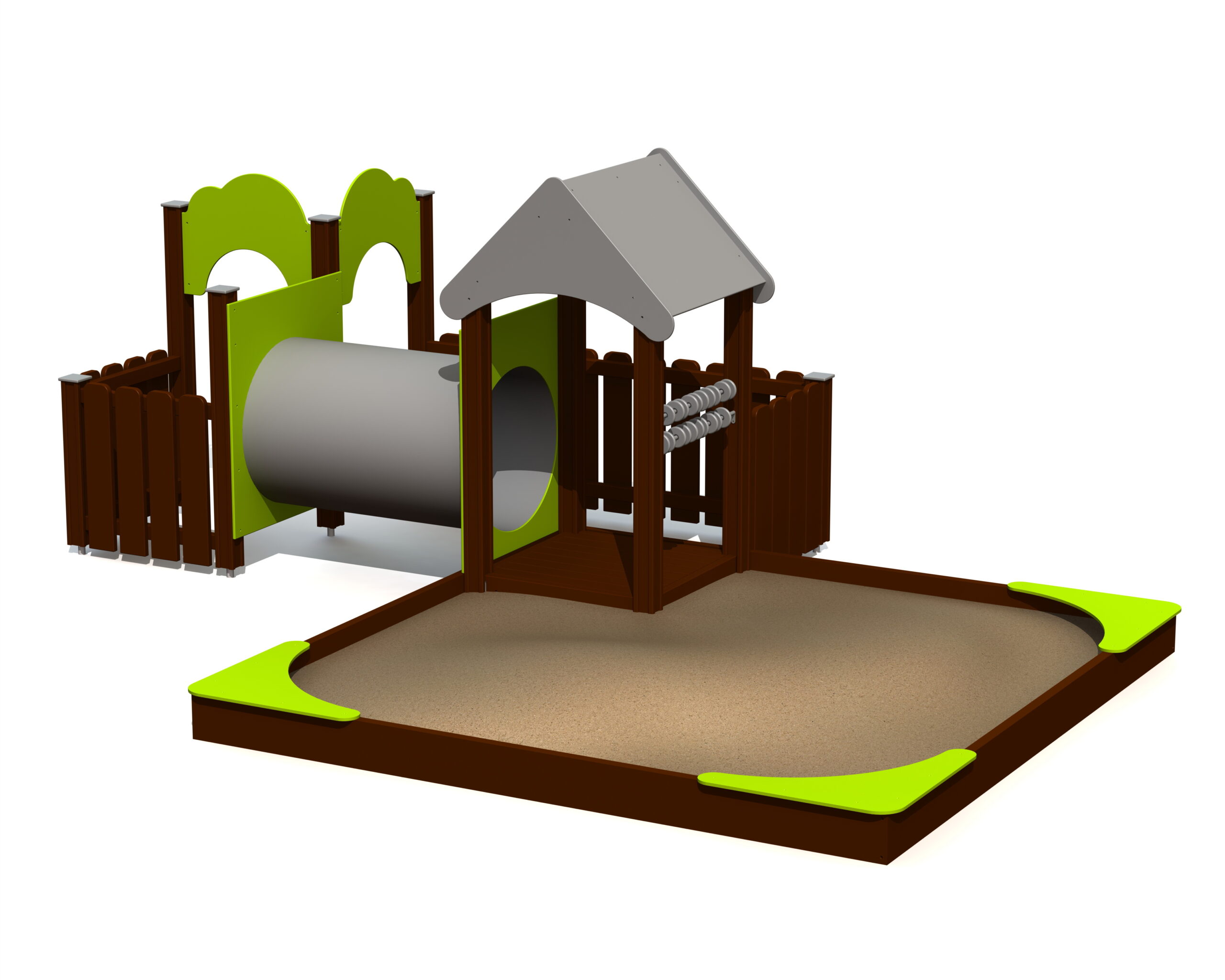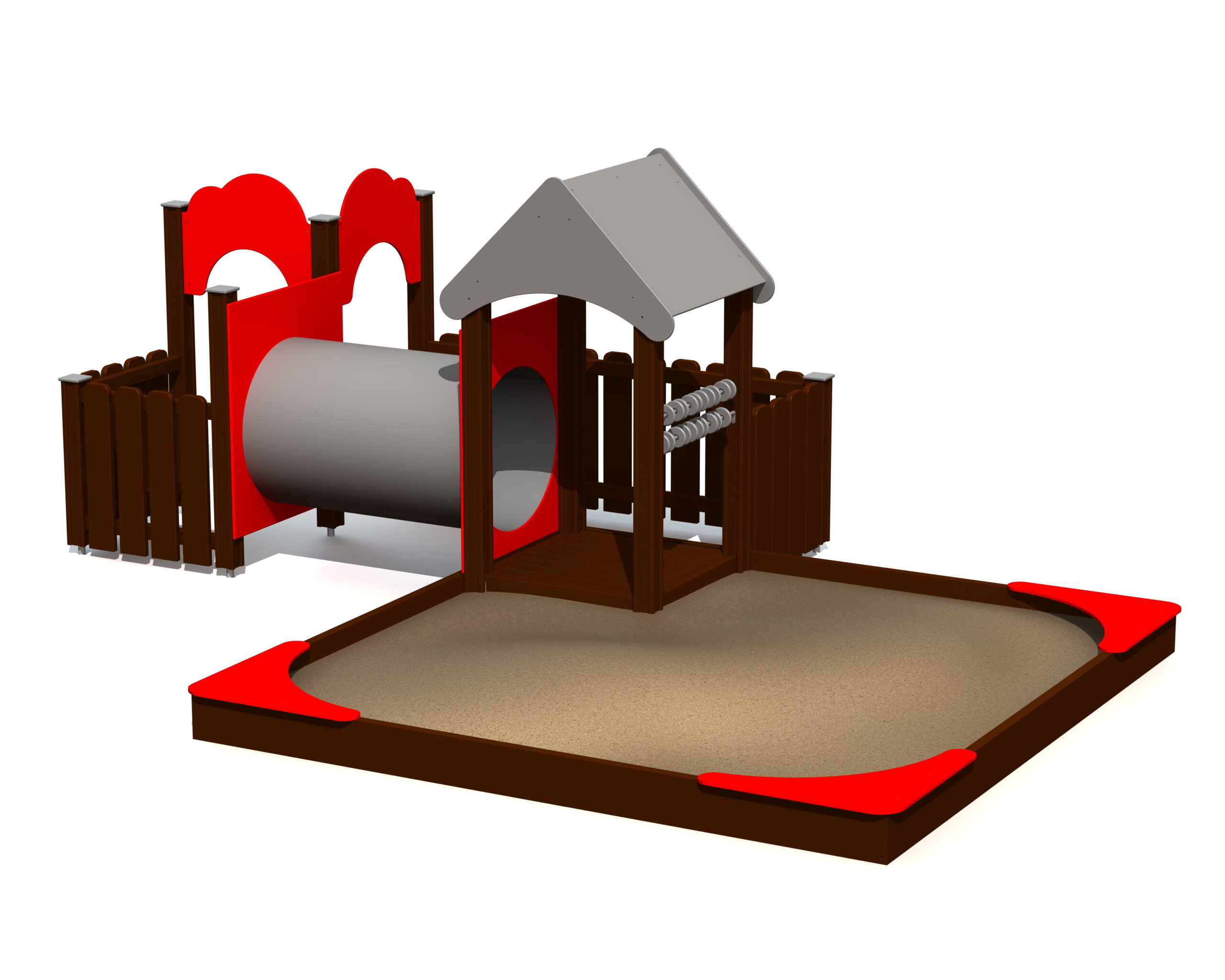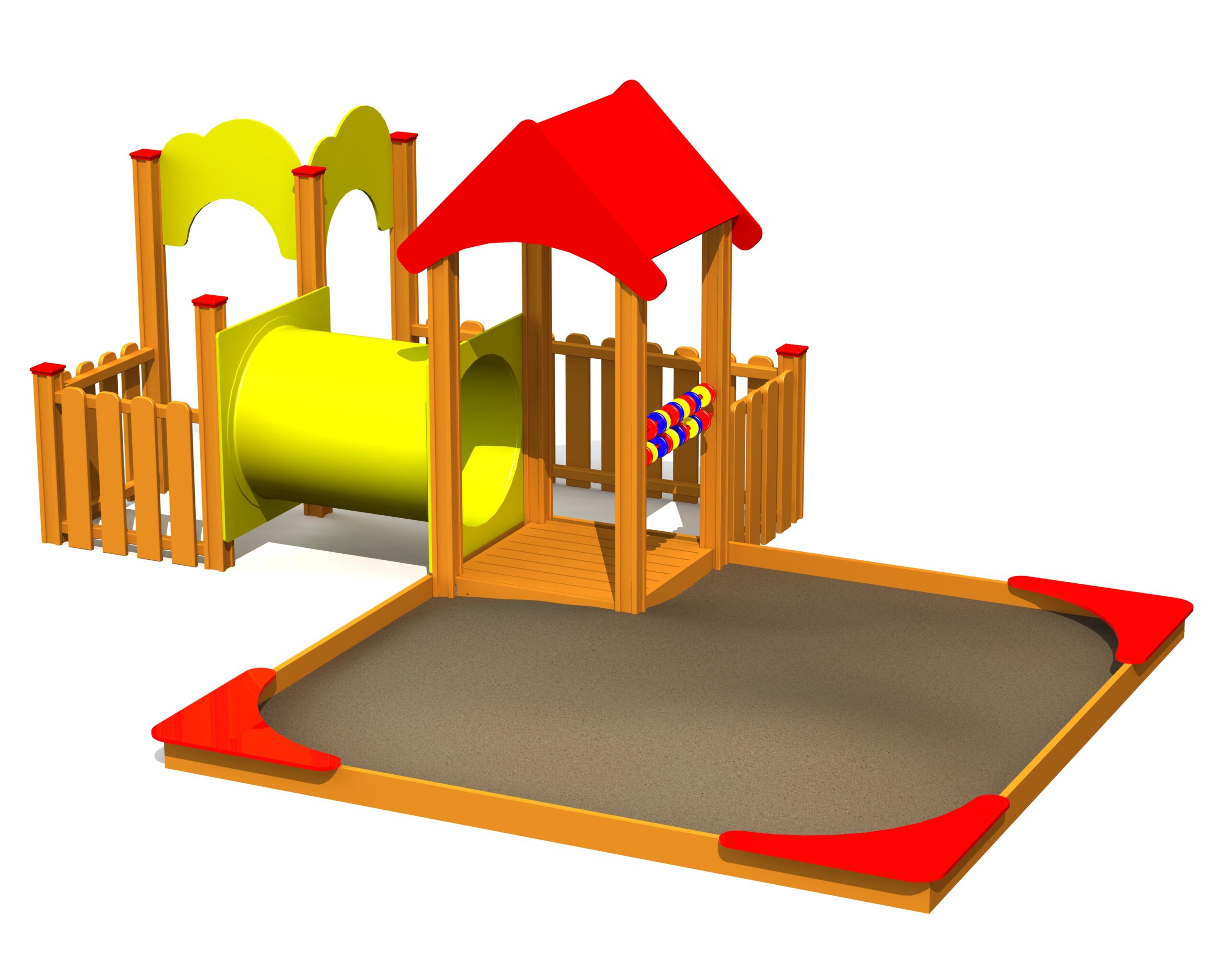 Lekcenterset med sandlåda i laminerat trä och integrerad lekstuga. Sandlådan har tre färgglada hörnplattor i HDPE som ger extra ytor för sandlek och förvaring. Lekstugan med tak skyddar mot sol och regn och uppmuntrar rollspel och kreativitet. Kulram, kryptunnel och lekytor ger variation i leken. Levereras med foder som hindrar jordblandning och ogräs. Nätskydd kan beställas. Sandlådan levereras utan sand.