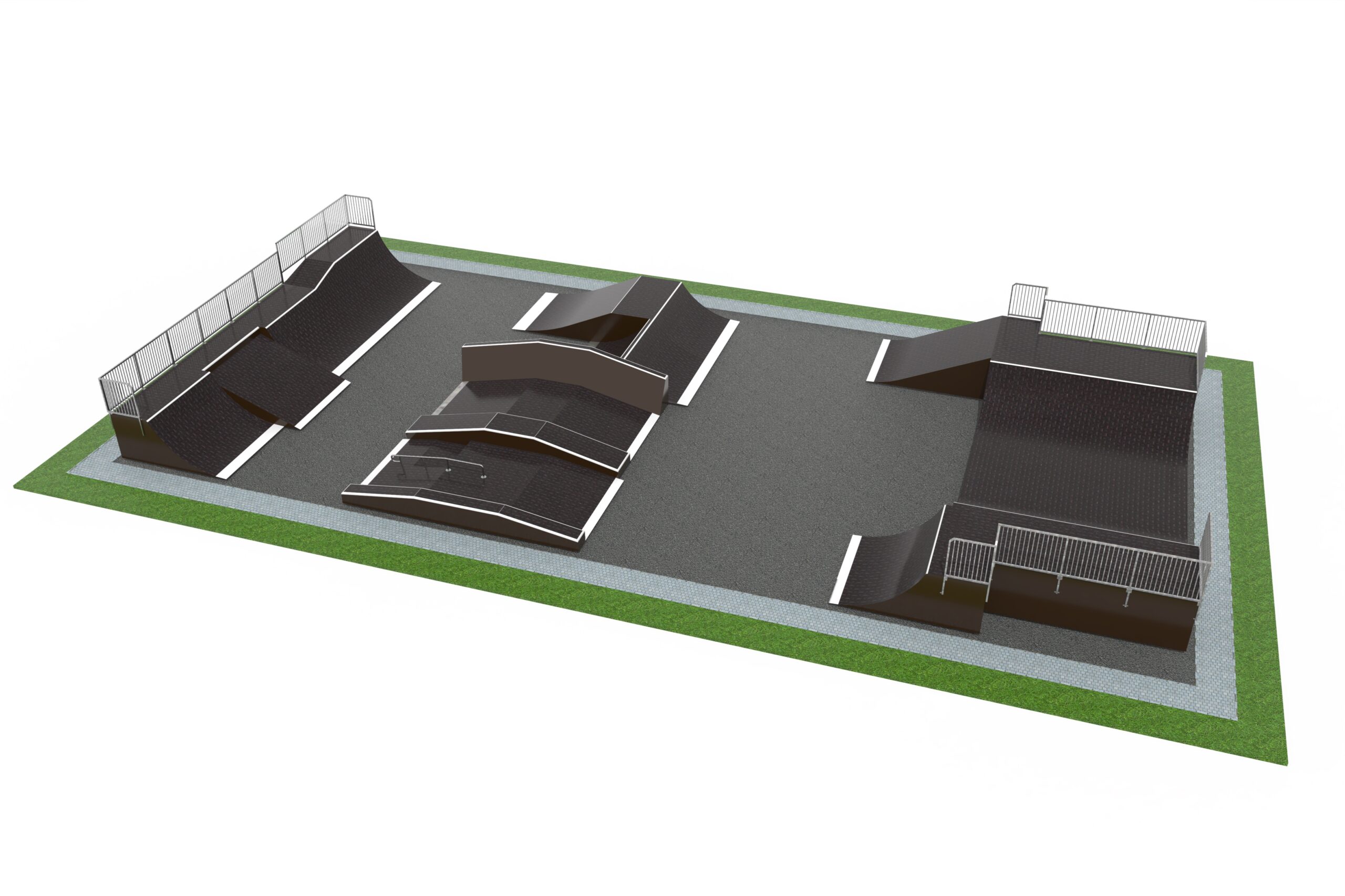 Skateboard Adina är utformad som skateparklösning för skateparker och offentliga aktivitetsytor. Mått: L 15 m, B 30 m, H 1,8 m.