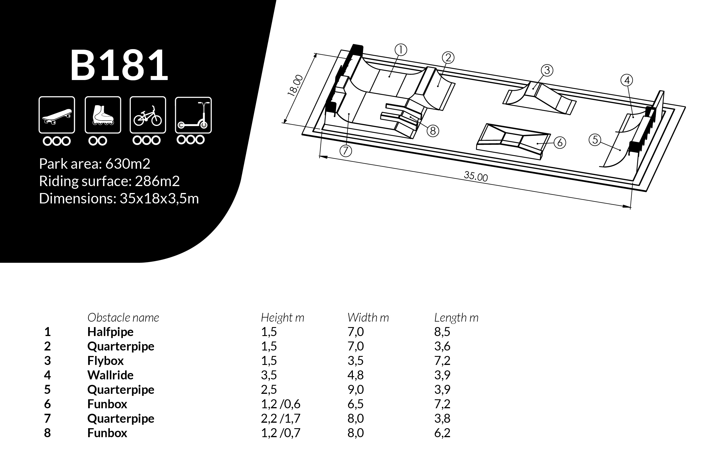 Skateboard Cornelia är utvecklad för offentlig skateanläggning och används i skateparksmiljö. Modellen fungerar som skateparklösning i linjer och kombinationer där man vill skapa ett säkert och varierat åkflöde för flera nivåer av åkare. Konstruktionen är avsedd för utomhusbruk med fokus på hållbarhet, funktion och stabil drift vid hög belastning. Produktmått: L 18 m, B 35 m, H 3,5 m.