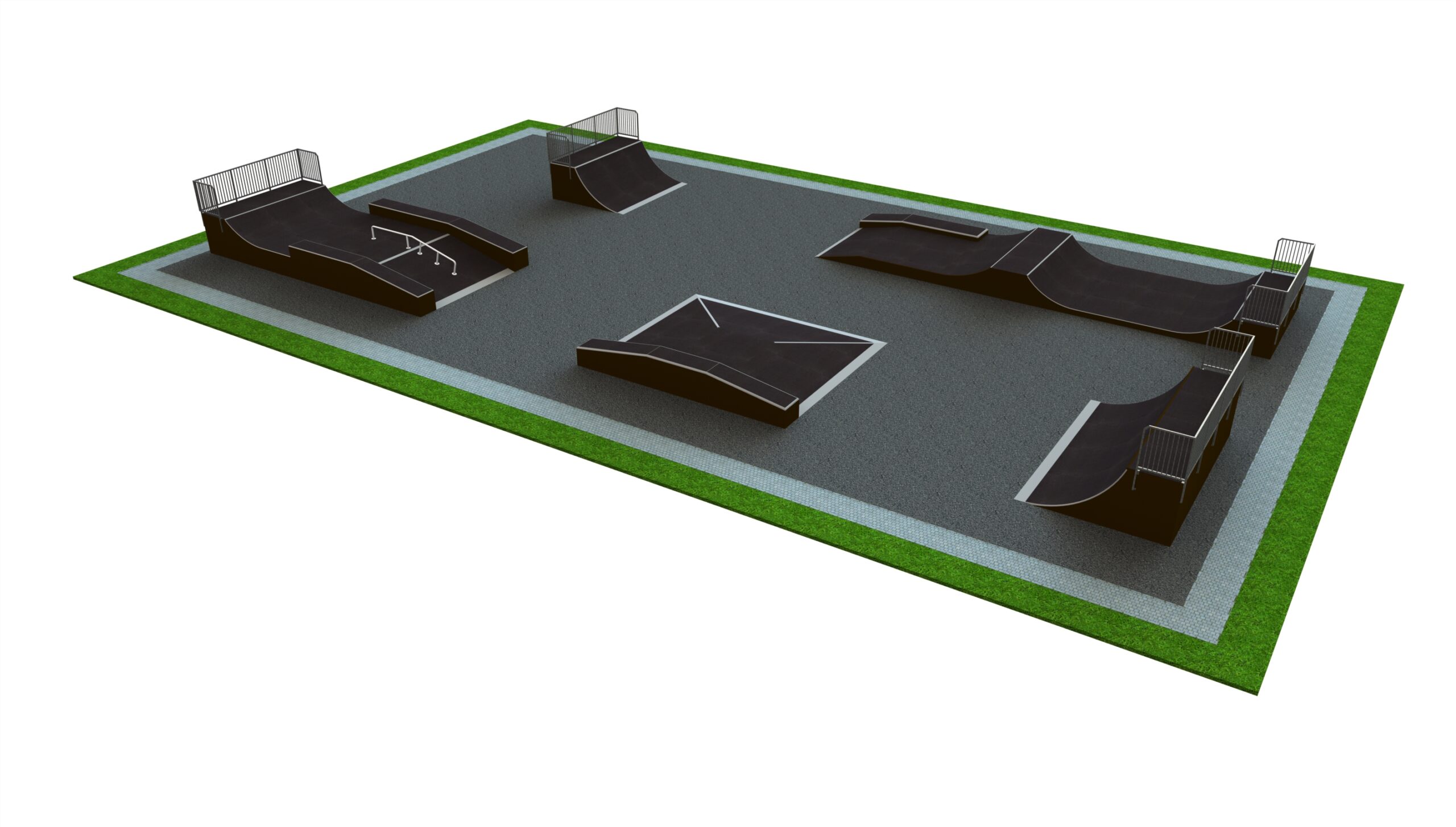 Skateboard Ebba är utformad som skateparklösning för skateparker och offentliga aktivitetsytor. Mått: L 20 m, B 35 m, H 1,7 m.