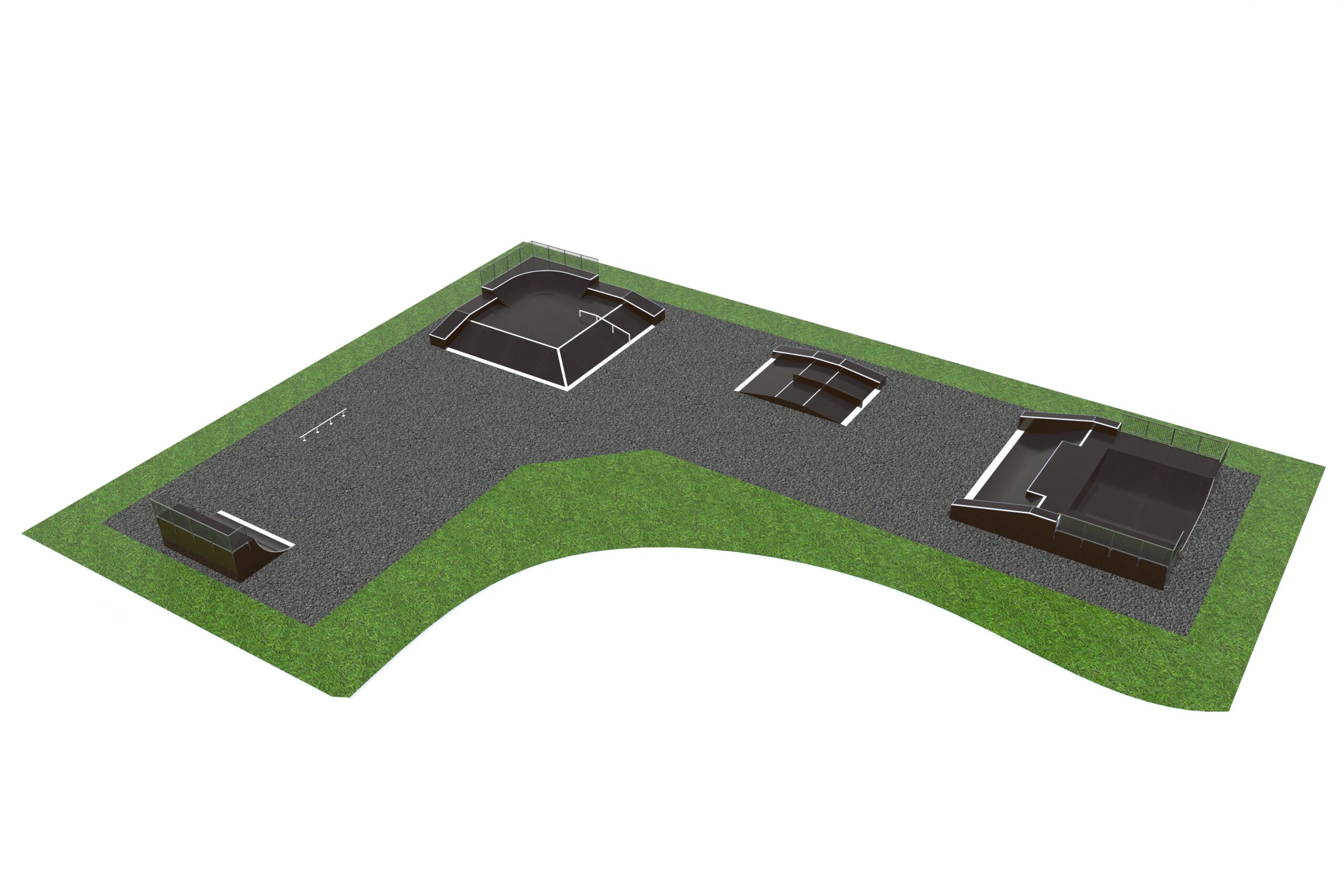 Skateboard Elin är utformad som skateparklösning för skateparker och offentliga aktivitetsytor. Mått: L 37 m, B 50 m, H 2 m.