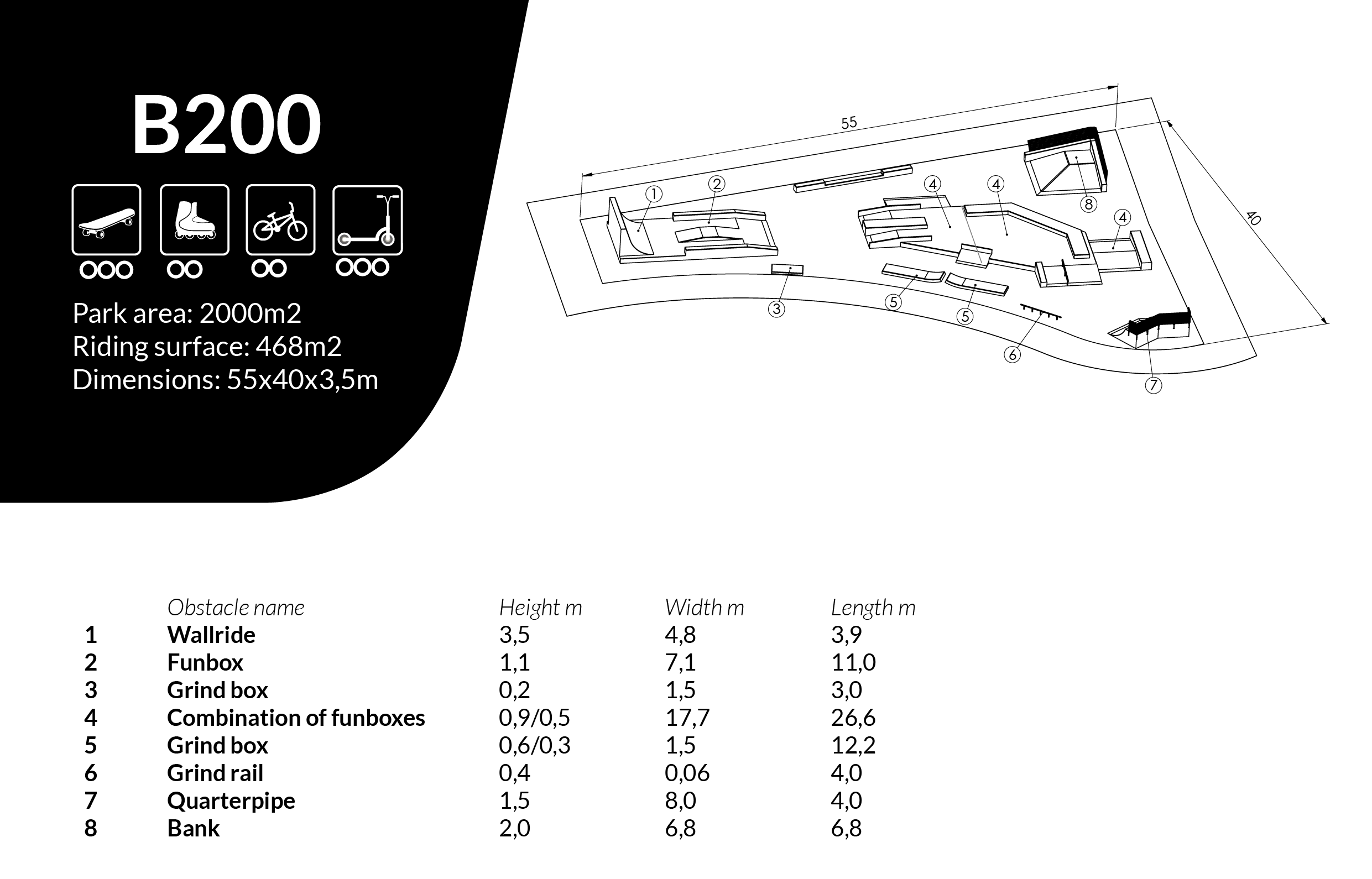 Skateboard Emma är utformad som skateparklösning för skateparker och offentliga aktivitetsytor. Mått: L 40 m, B 55 m, H 3,5 m.