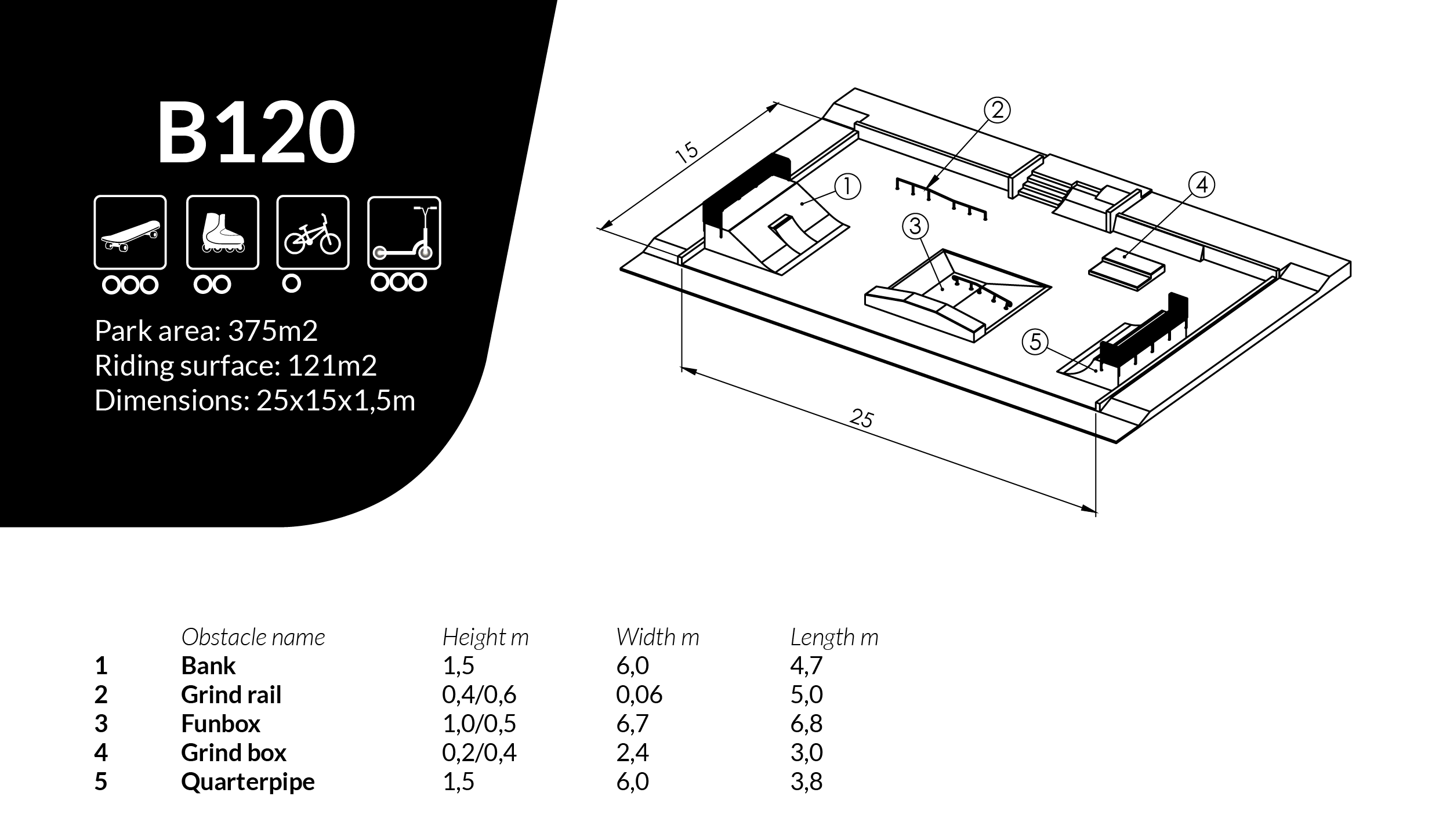 Skateboard Olivia är utvecklad för offentlig skateanläggning och används i skateparksmiljö. Modellen fungerar som skateparklösning i linjer och kombinationer där man vill skapa ett säkert och varierat åkflöde för flera nivåer av åkare. Konstruktionen är avsedd för utomhusbruk med fokus på hållbarhet, funktion och stabil drift vid hög belastning. Produktmått: L 15 m, B 25 m, H 1,5 m.