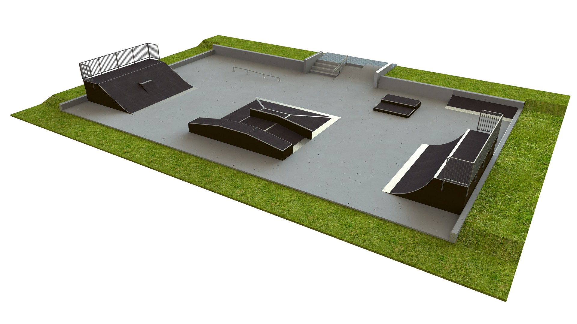 Skateboard Olivia är utformad som skateparklösning för skateparker och offentliga aktivitetsytor. Mått: L 15 m, B 25 m, H 1,5 m.