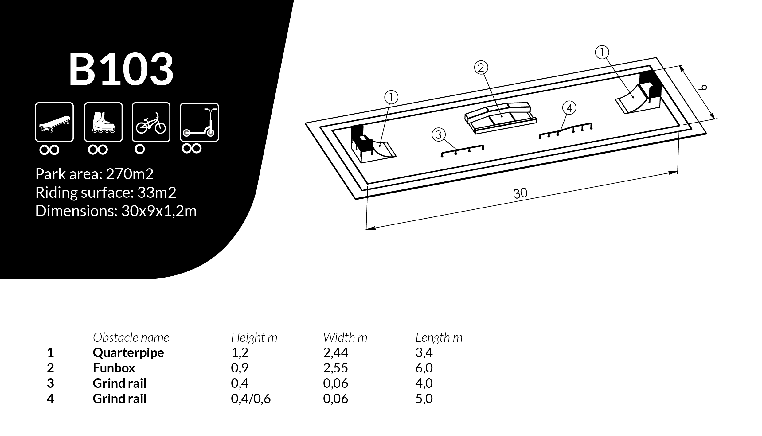 Skateboard Paulina är utvecklad för offentlig skateanläggning och används i skateparksmiljö. Modellen fungerar som skateparklösning i linjer och kombinationer där man vill skapa ett säkert och varierat åkflöde för flera nivåer av åkare. Konstruktionen är avsedd för utomhusbruk med fokus på hållbarhet, funktion och stabil drift vid hög belastning. Produktmått: L 9 m, B 30 m, H 1,2 m.