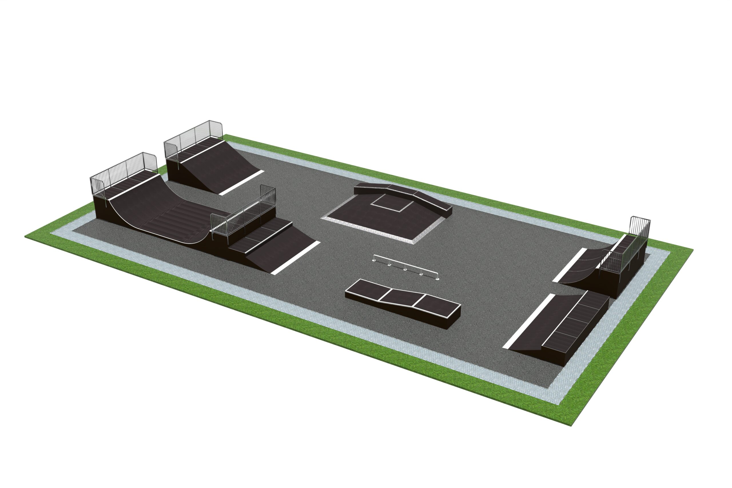 Skateboard Selma är utformad som skateparklösning för skateparker och offentliga aktivitetsytor. Mått: L 15 m, B 30 m, H 1,5 m.